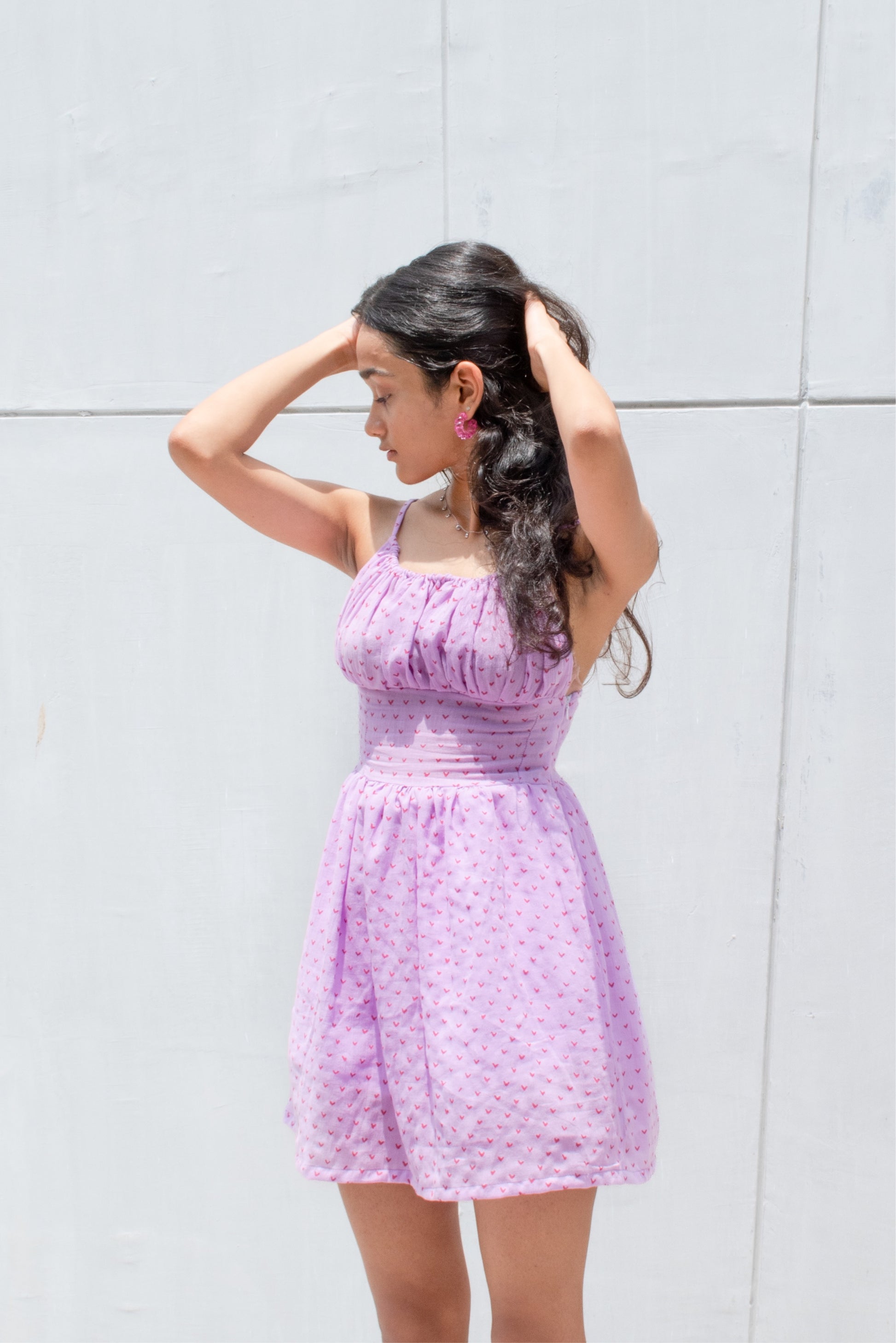 The Alani Dress in Lilac is a light, summery dress perfect for a vacay! With cute little hearts and an even cuter silhouette, this dress is both sweet and modest. The roughing detail at the bust not only makes the fit easier, but also flatters and hugs your body perfectly. This dress featured adjustable spaghetti straps and a side zipper for comfort. The fabric used is a light, hand block printed creased cotton.