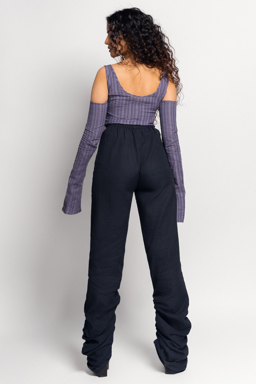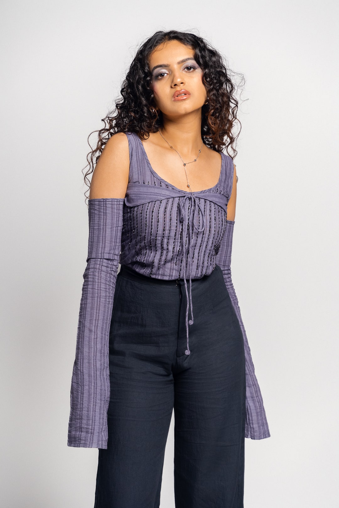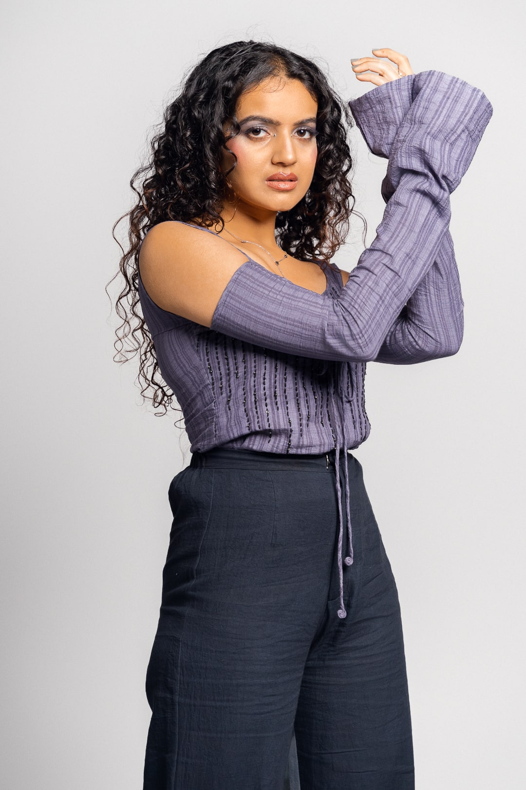 Quite literally taking after it's name, the Amaya top features stunning hand embroidered kantha stitches specked with sequins running down from the neckline, resembling the night rain. This is a perfect going out top with cut outs and a low scoop neck layered with a tie up at the bust, cold shoulders and sleeves that flare at the wrist. The top is made from a 100% cotton fabric with a striped weave variation.