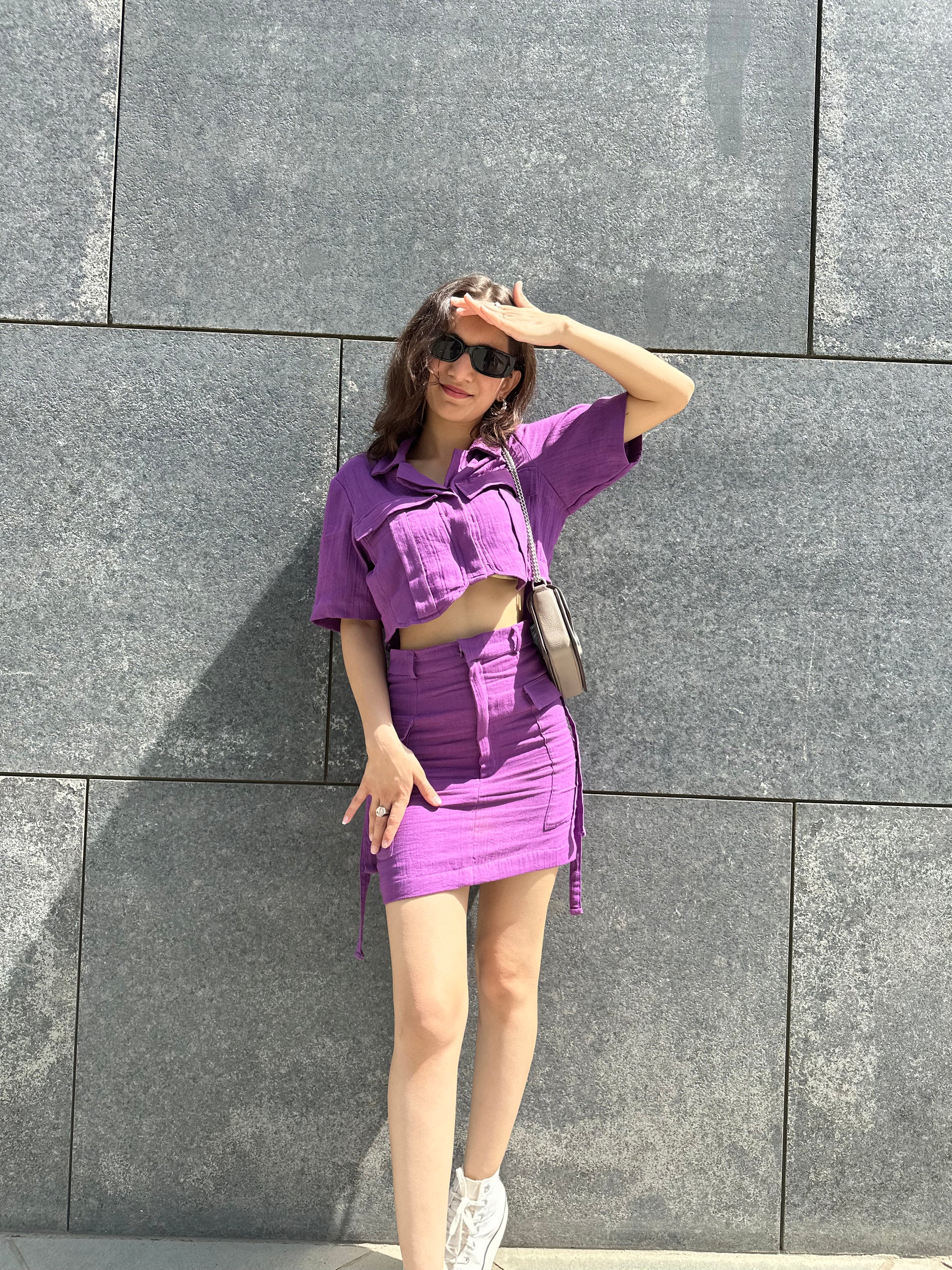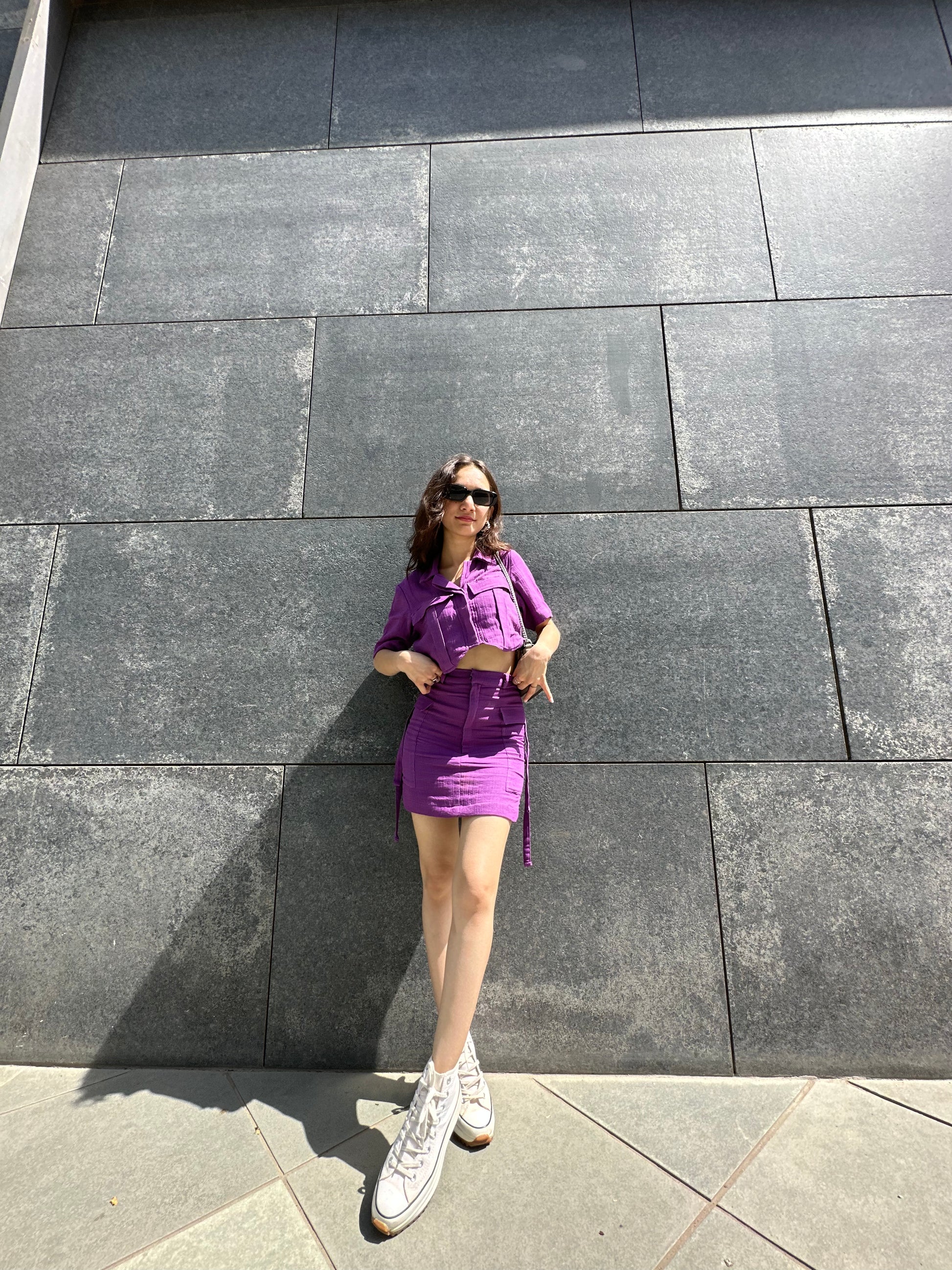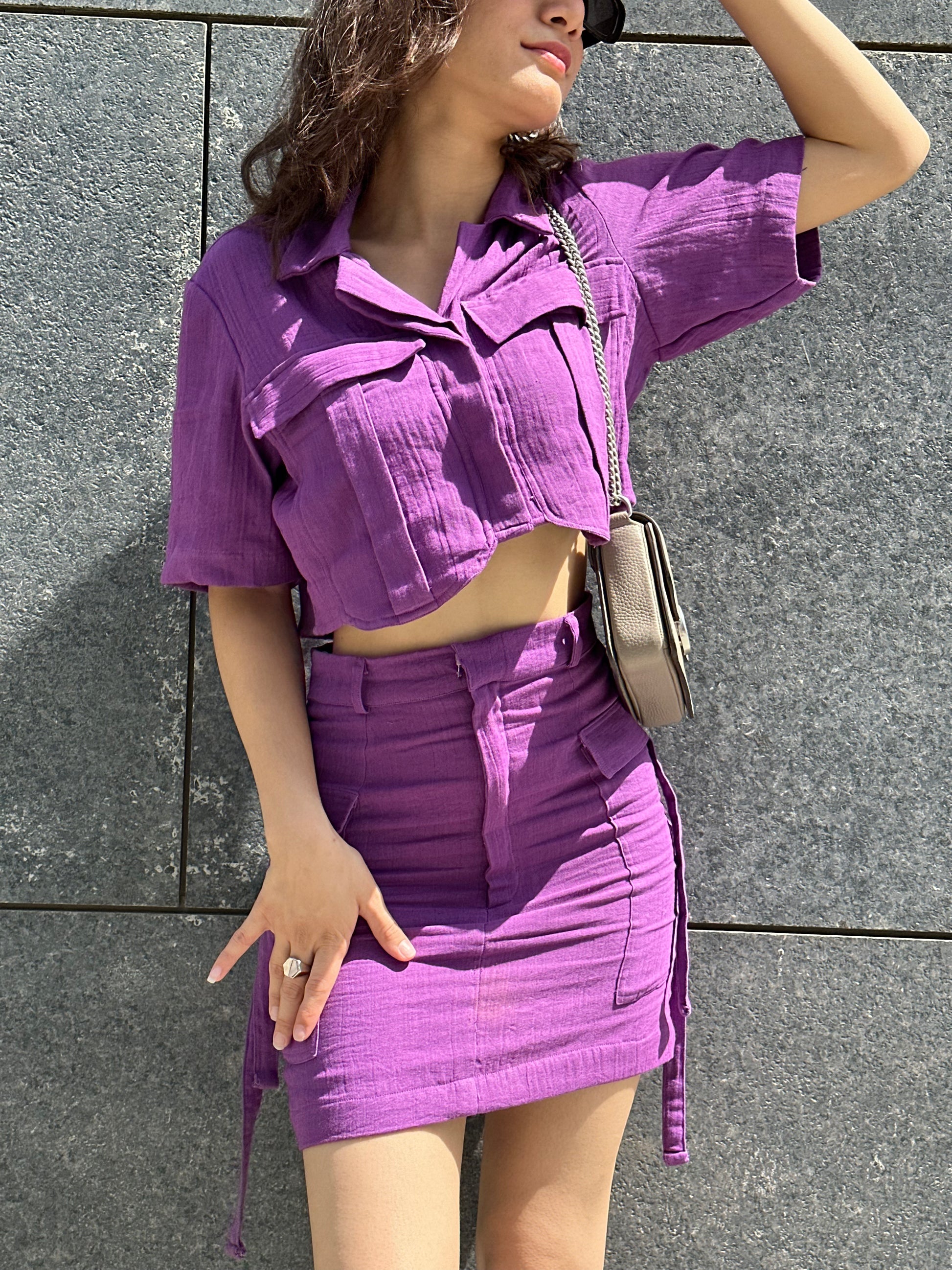 The Amethyst Cargo Set is a casual yet chic co-ord set, made with 100% cotton fabric. This set is made with a breathable double cloth. The A-line skirt has a zip and hook at the front along with two cargo pockets with cute tie details. For maximum utility, the cropped collared shirt has two pockets with flap detailing.💟
