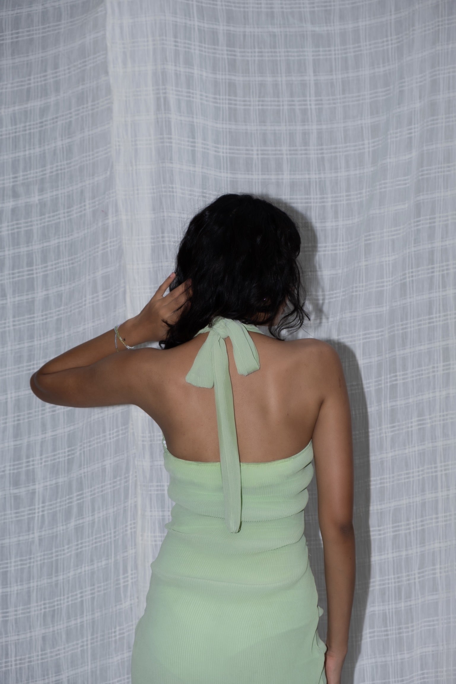 This halter neck mini dress is the perfect day to night look and a must have for your vacation. The halter neck of the dress features detailed beaded hand embroidery and ties at the back. The dress is fully lined and is made from a soft pleated chiffon fabric that hugs the body perfectly. The dress has a side opening for ease.