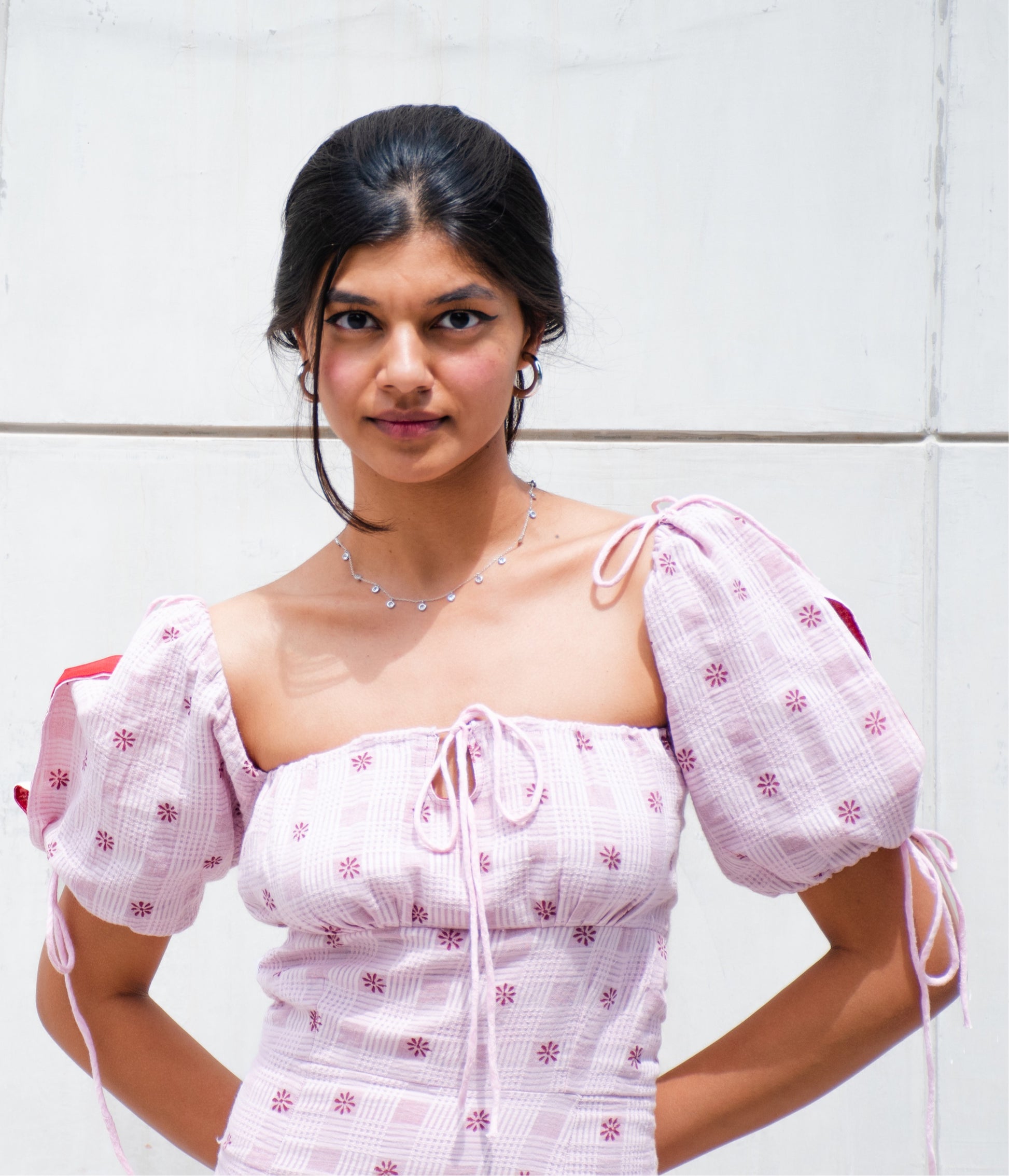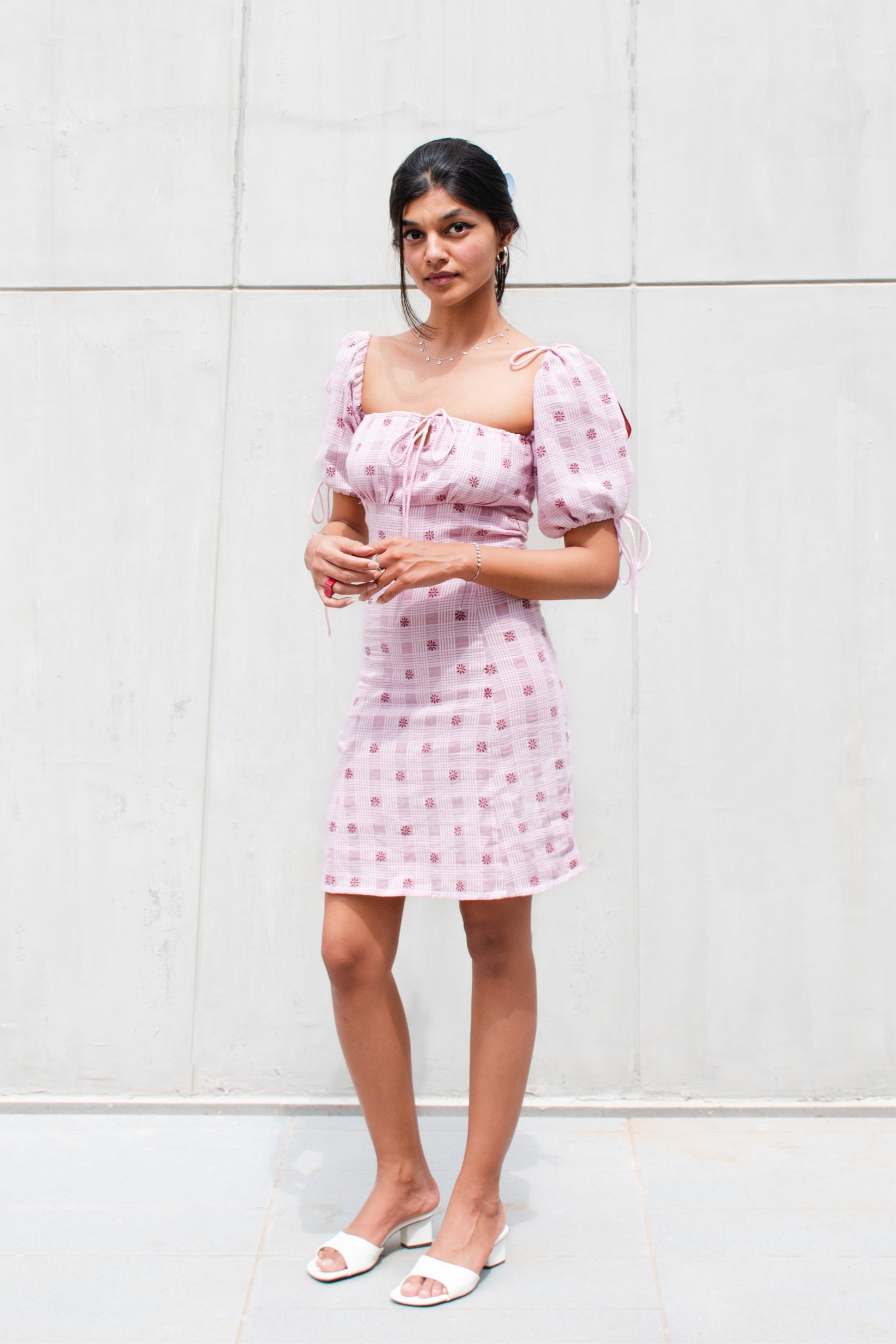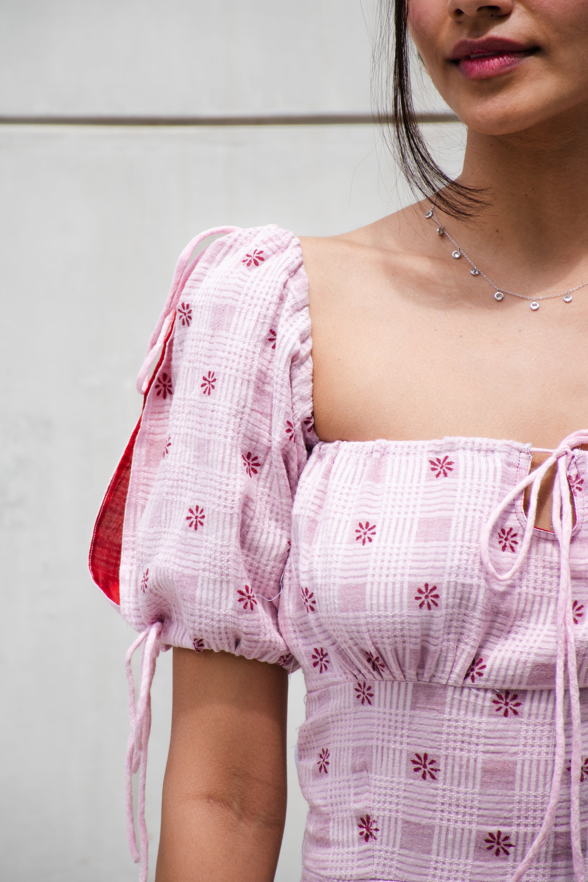 A fan favourite, the Callia Sugar print makes a comeback in a perfectly remixed silhouette. The silhouette features slit sleeves with dainty ties at the shoulder and hem, as well as the bust neckline. The dress is for fitting until the lower waist, where it flares out slightly. The dress has a side zipper, and is fully lined with a contrasting maroon cotton fabric. The print consists of a woven cotton cheered fabric embellished with hand block printed floral motifs.