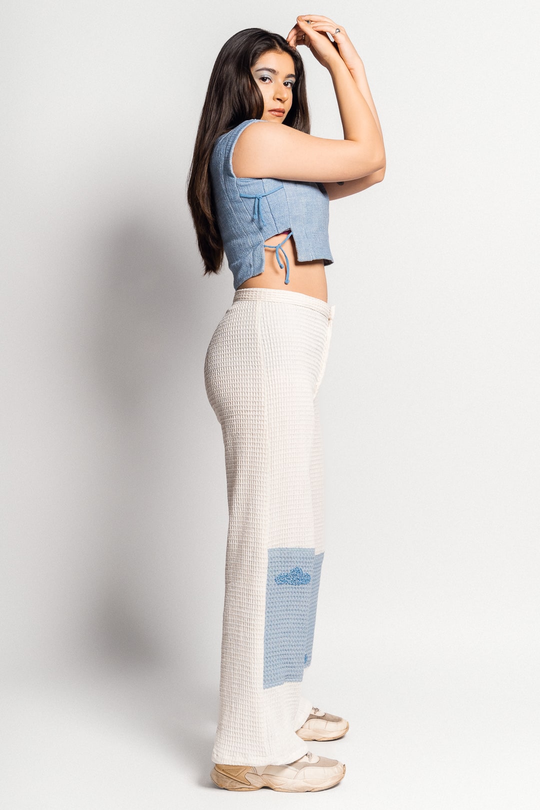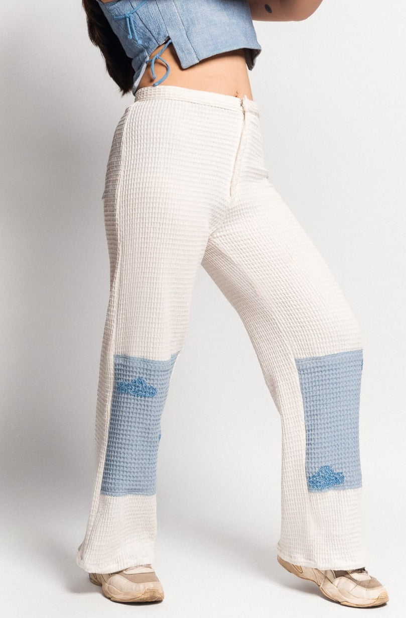 That's exactly how these pants will make you feel. Made from soft, white and a 100% cotton waffle woven fabric, these pants will definitely feel like clouds on your skin. The pants are cut to the perfect high waist and relaxed fit. They feature blue pants on the bottom with hand embroidered kantha clouds.