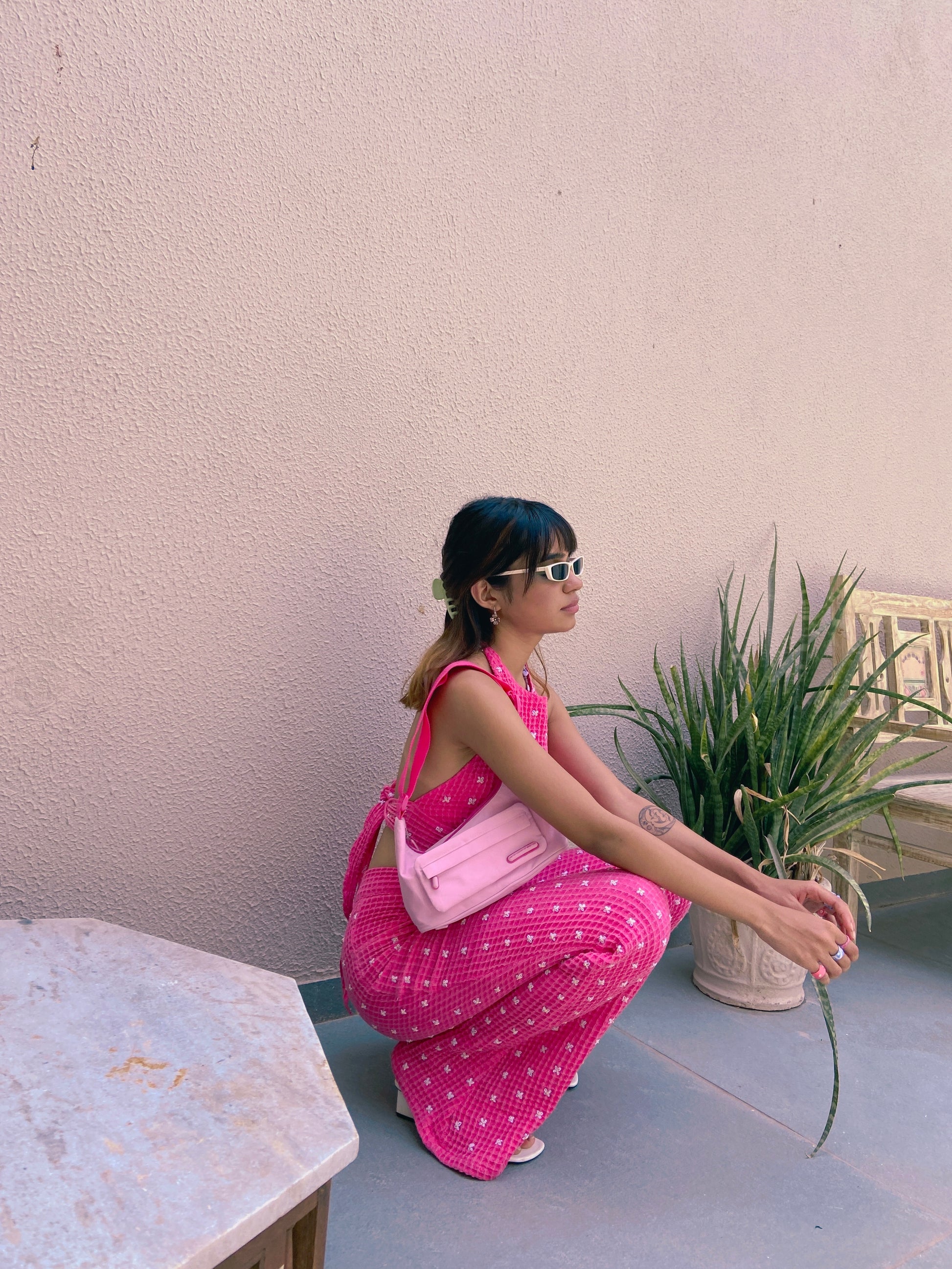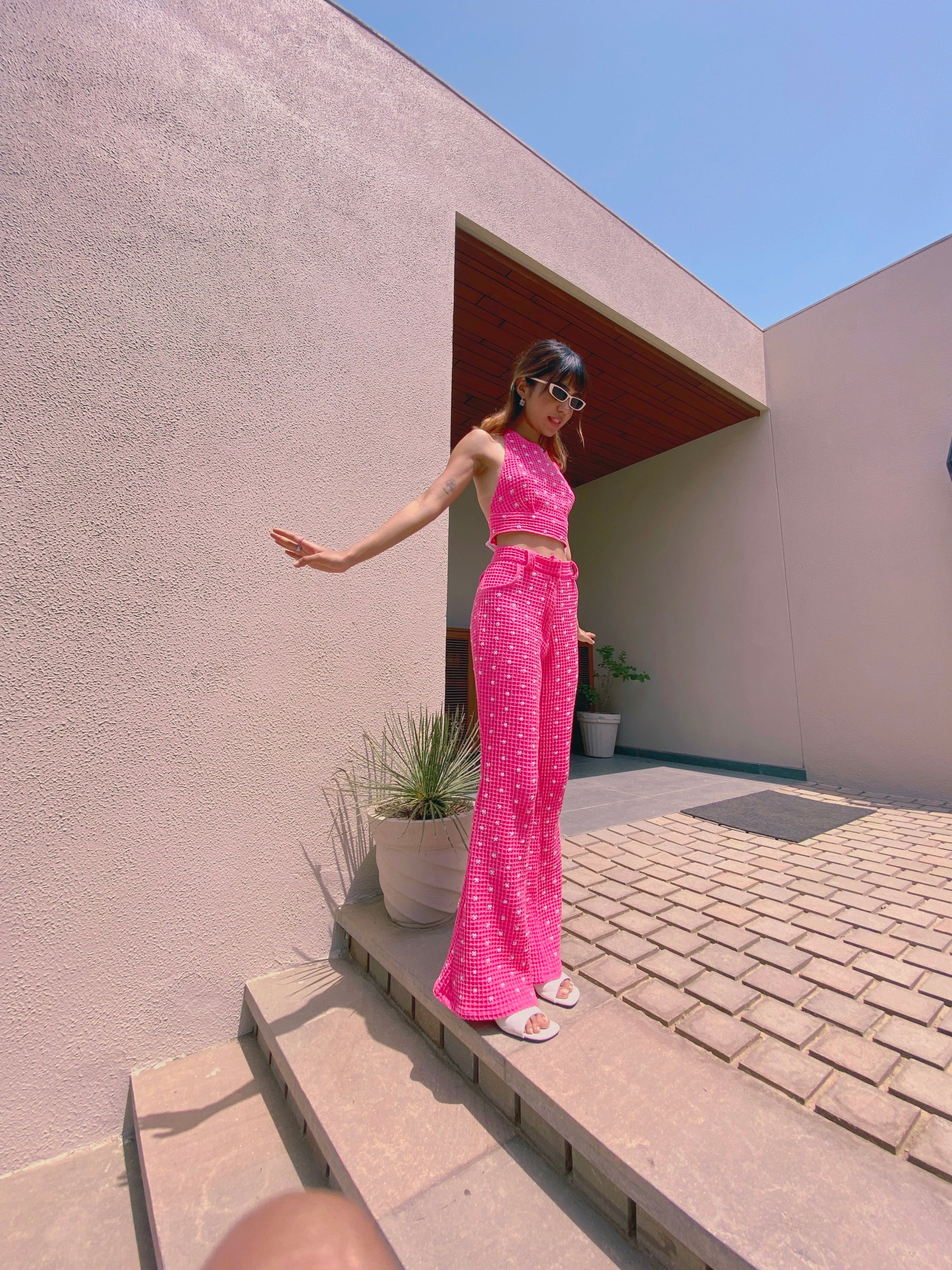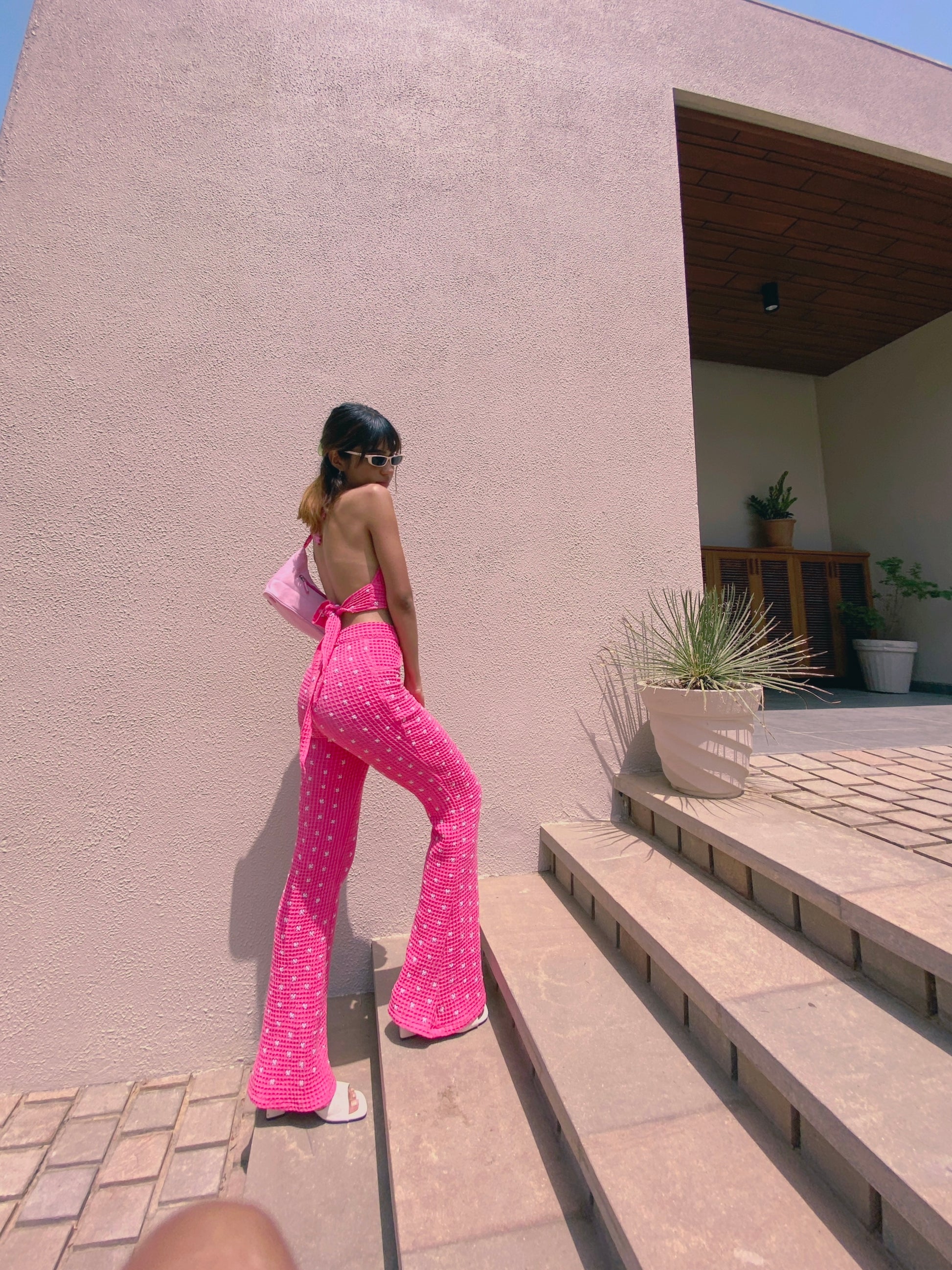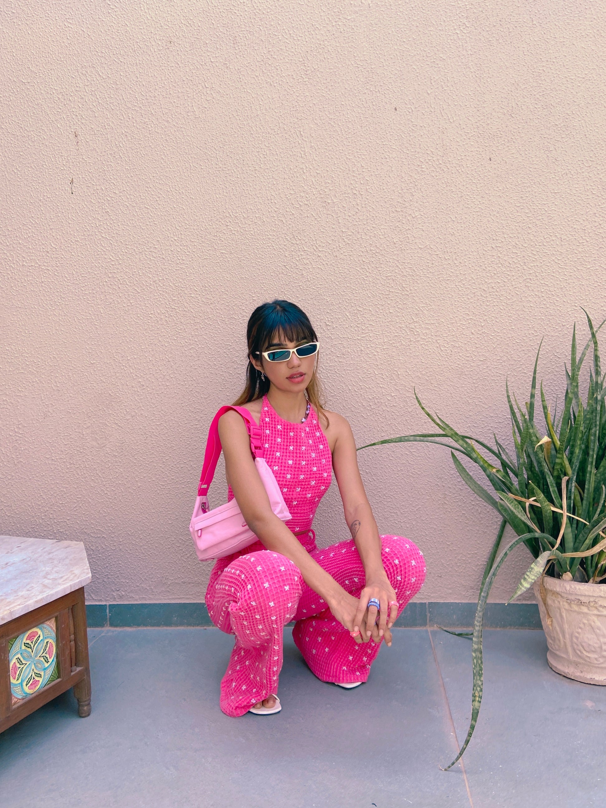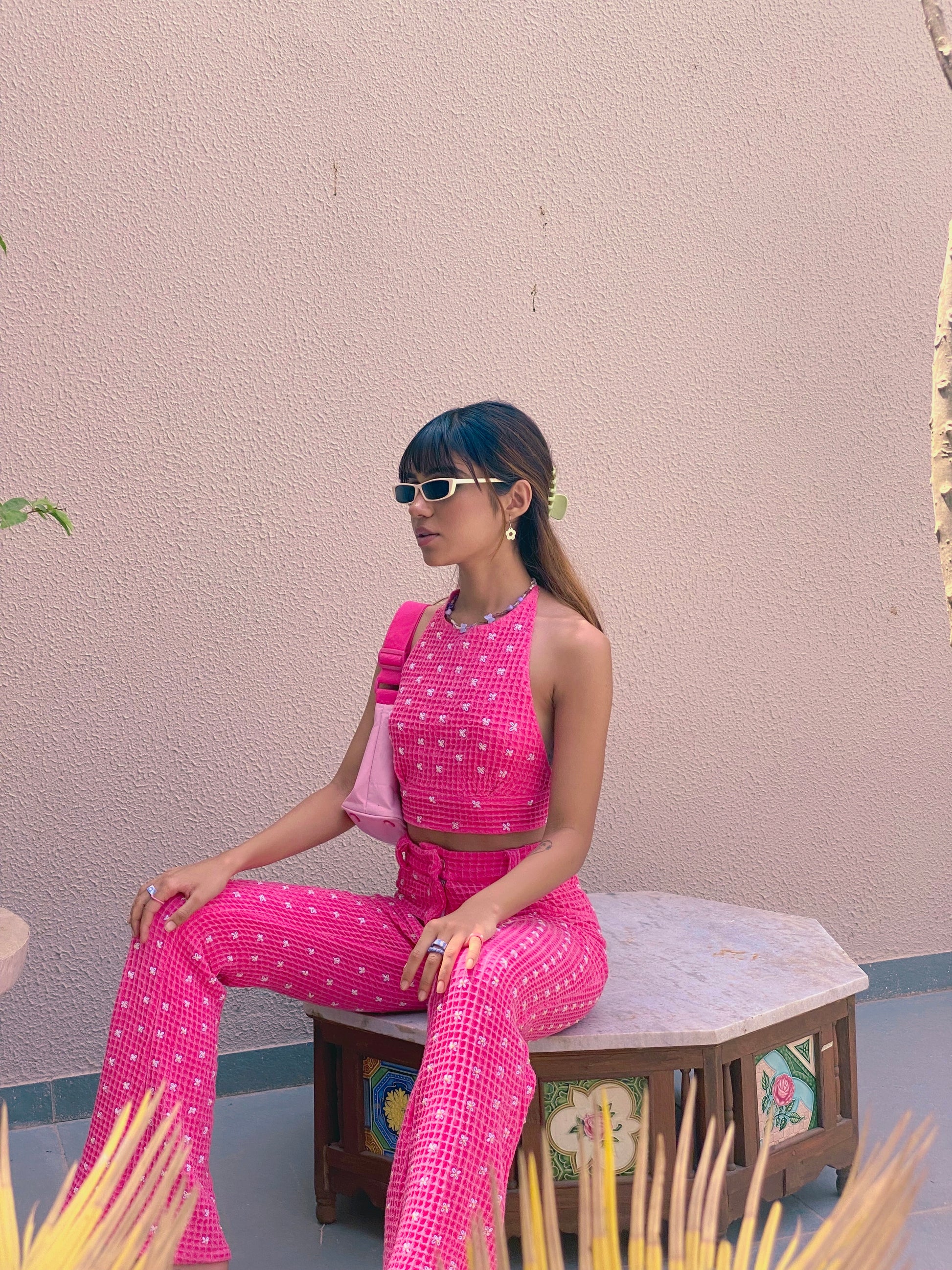 The OG Pink Daisy set that quite literally broke our DMs with demand is now back for a limited time! The soft and stretchy cotton waffle fabric makes the perfect base for a statement outfit that still feels like a loungewear set. The set features over a hundred hand embroidered daisies scattered throughout the top and pants, finished off with motis (beads). The top has a halter high neck cut with spaghetti straps at the neck and similarly mites at the back with straps. The pants are high waisted and snug fit down the thighs, then flaring out perfectly to resemble the perfect 70s cut. Please Petrol Wash only!