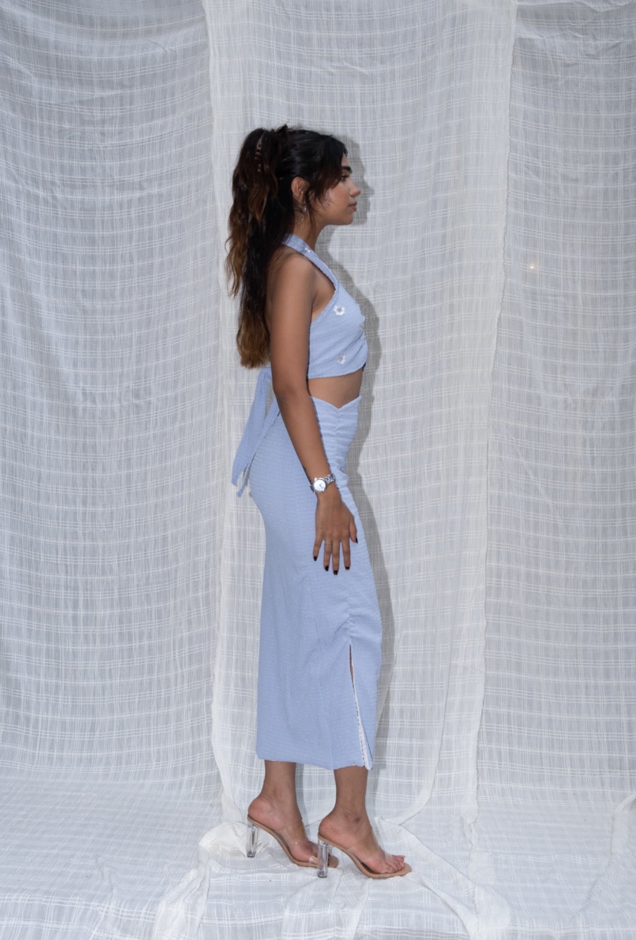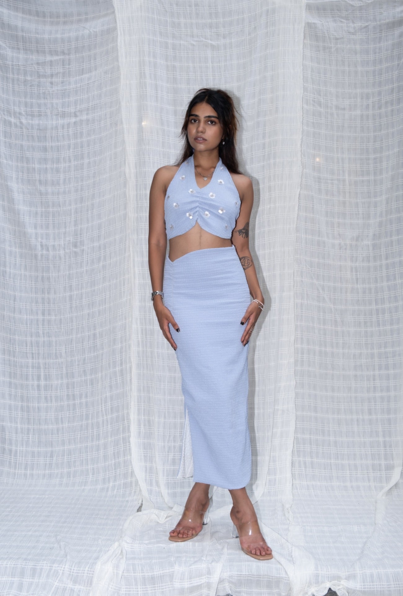 The Fiji Set is a cool blue co-ord that consists of a halter neck backless top and an asymmetrical midi skirt. The Fiji Top has ties at the neck and well as the back, and also features embroidered flowers made from beads and sequins. The skirt is asymmetrical at the waist, has gathers at the hip and also a side slit for ease. The fabric is a medium weight polyester blend seer sucker that is rich to the feel. This set can be bought together or separately.