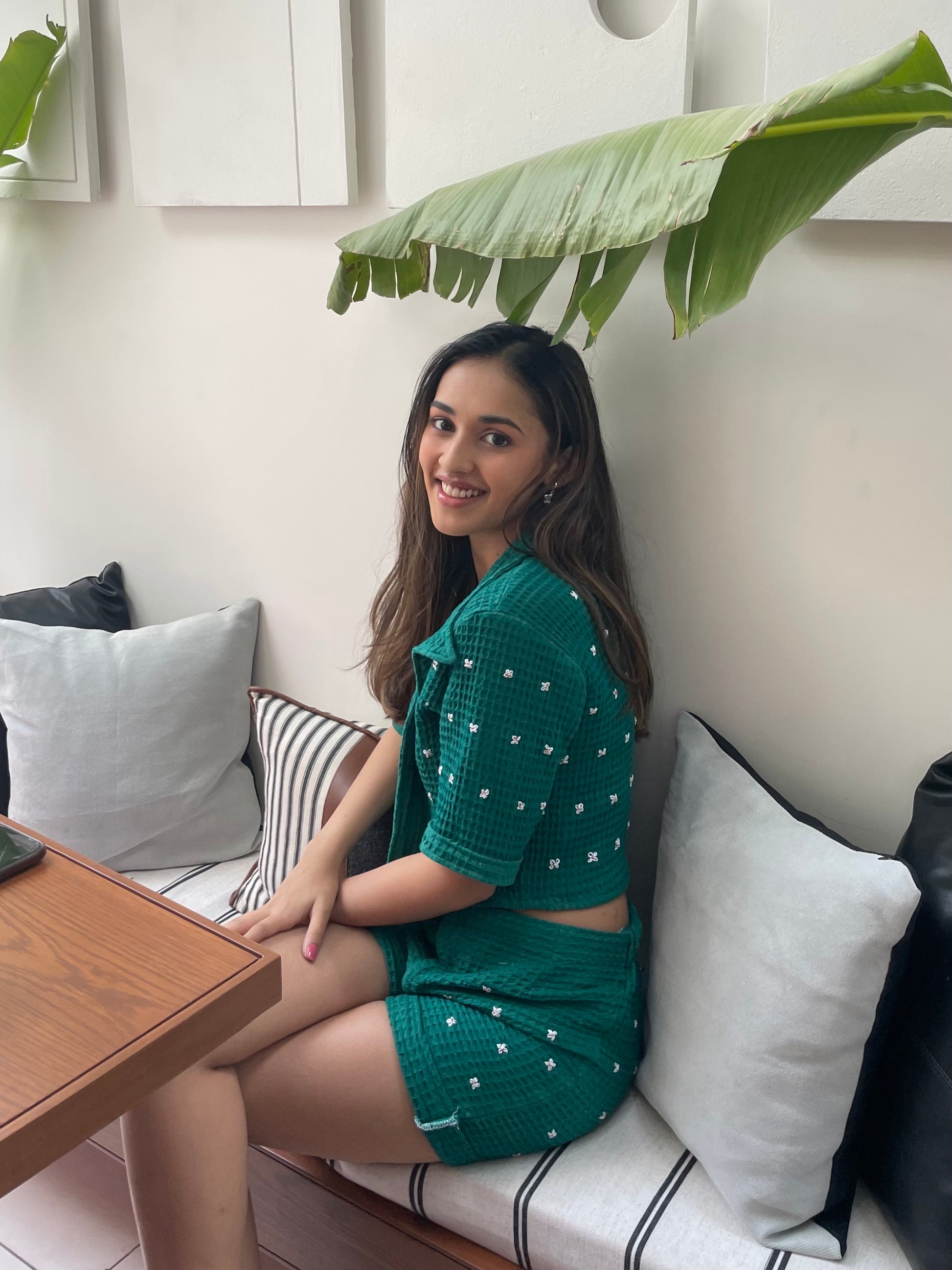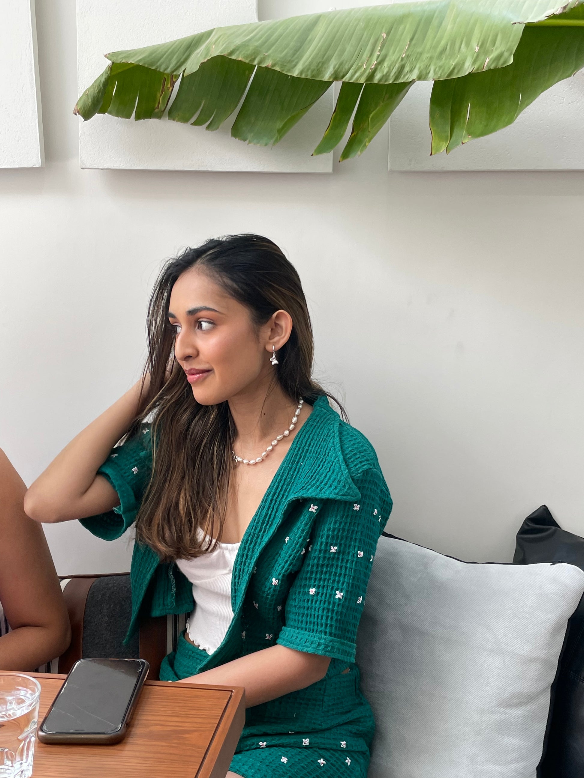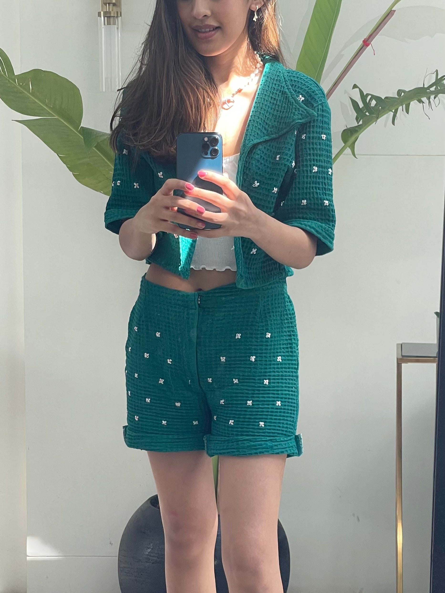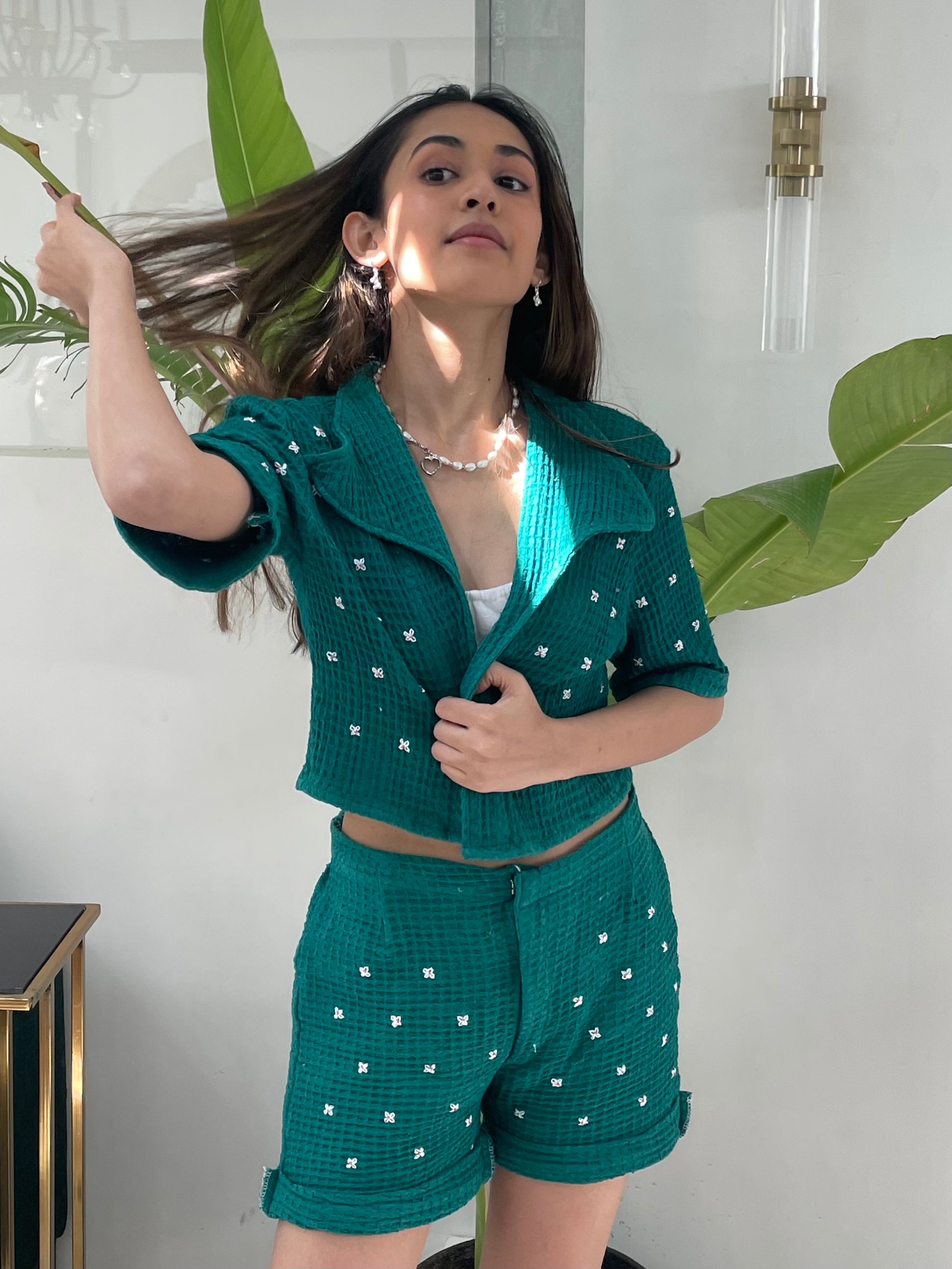 A spin off of our beloved Daisy set, this lush and fresh green set is perfect for both, mountain or beach getaways. Made out of a stretchy 100% cotton waffle knit fabric, it is sprinkled with hand embroidered daisy’s and beads. The set includes a relaxed-fit cropped shirt and a pair of easy going relaxed shorts, perfect for lounging or dressing it up.