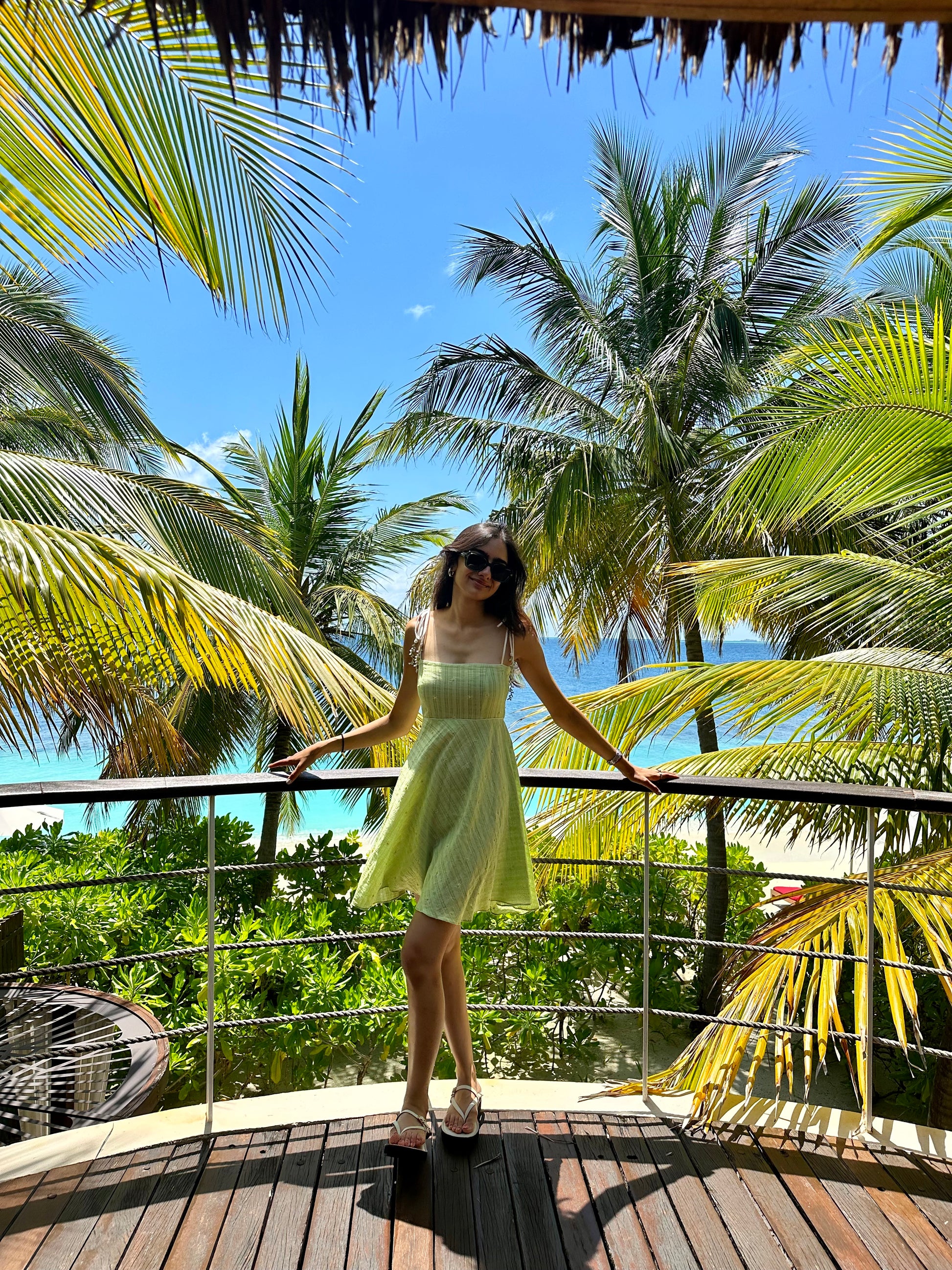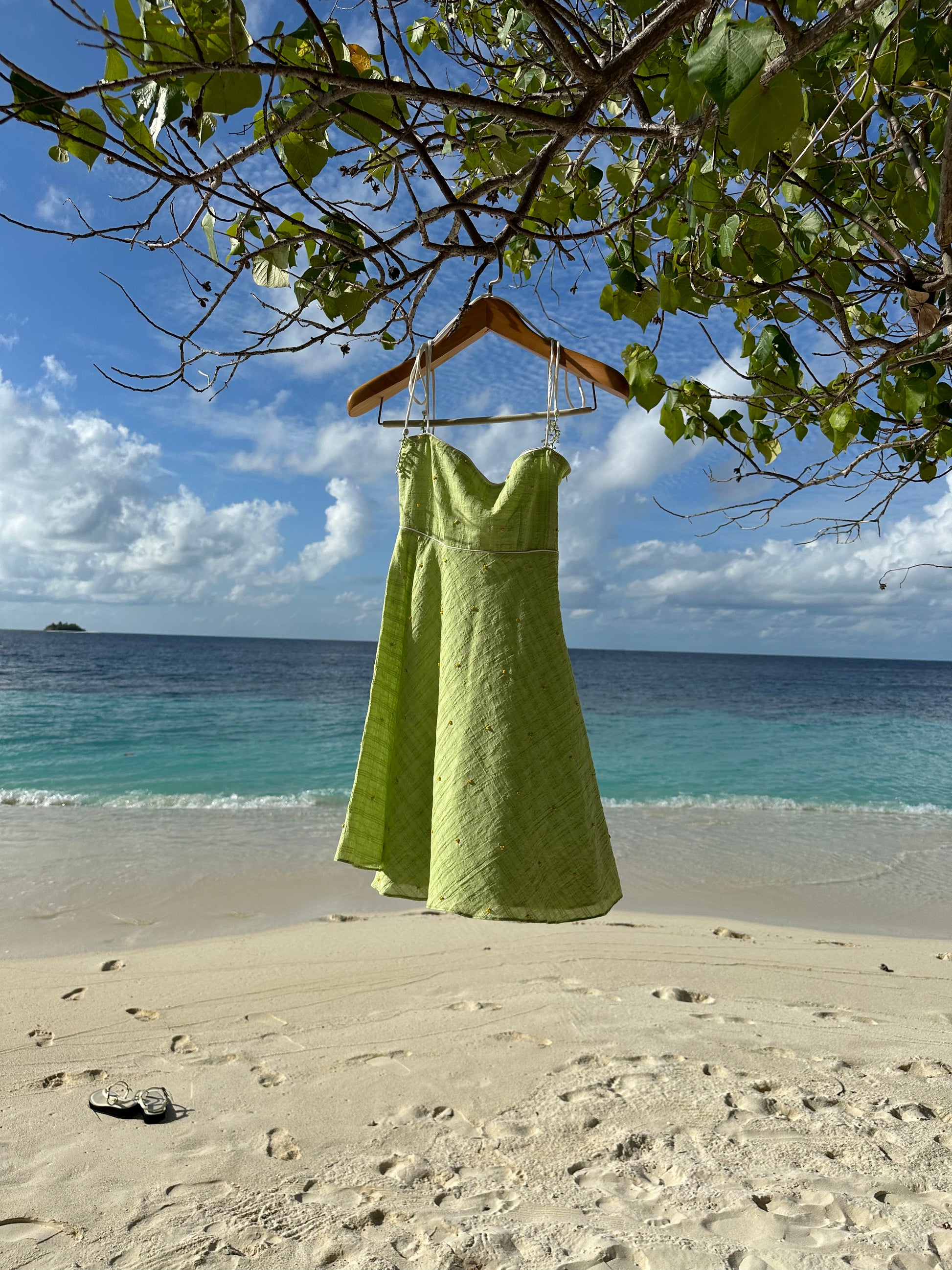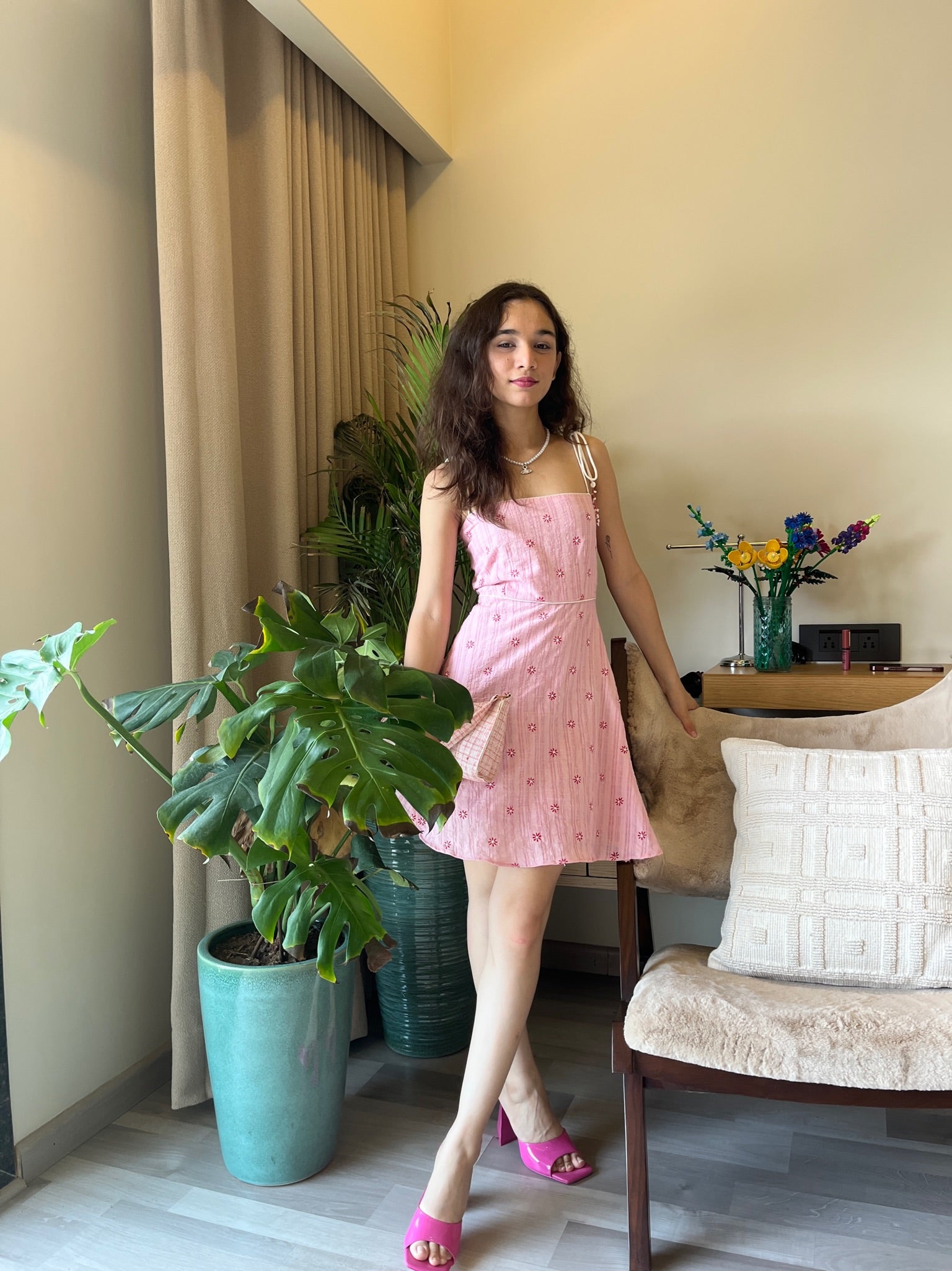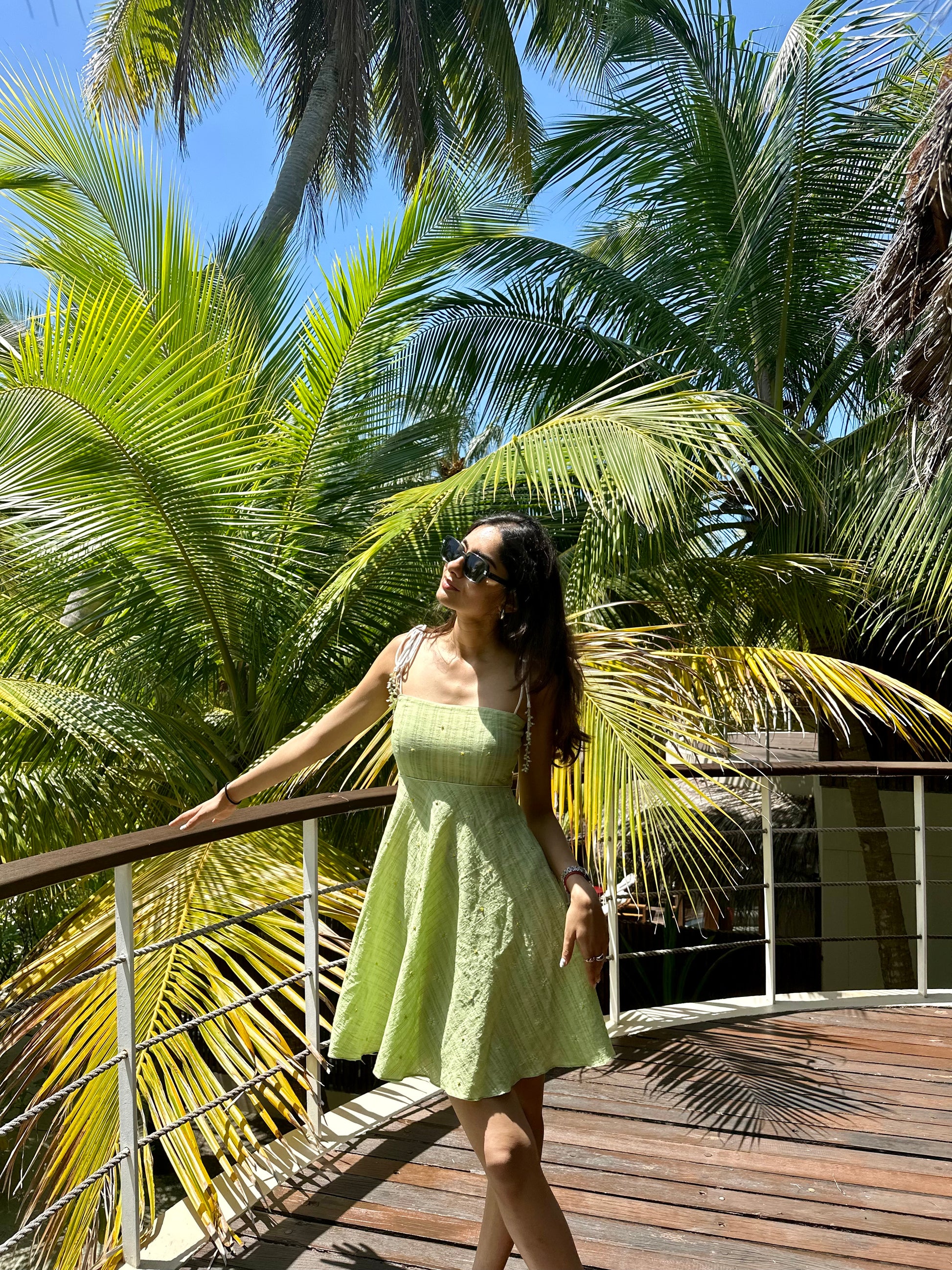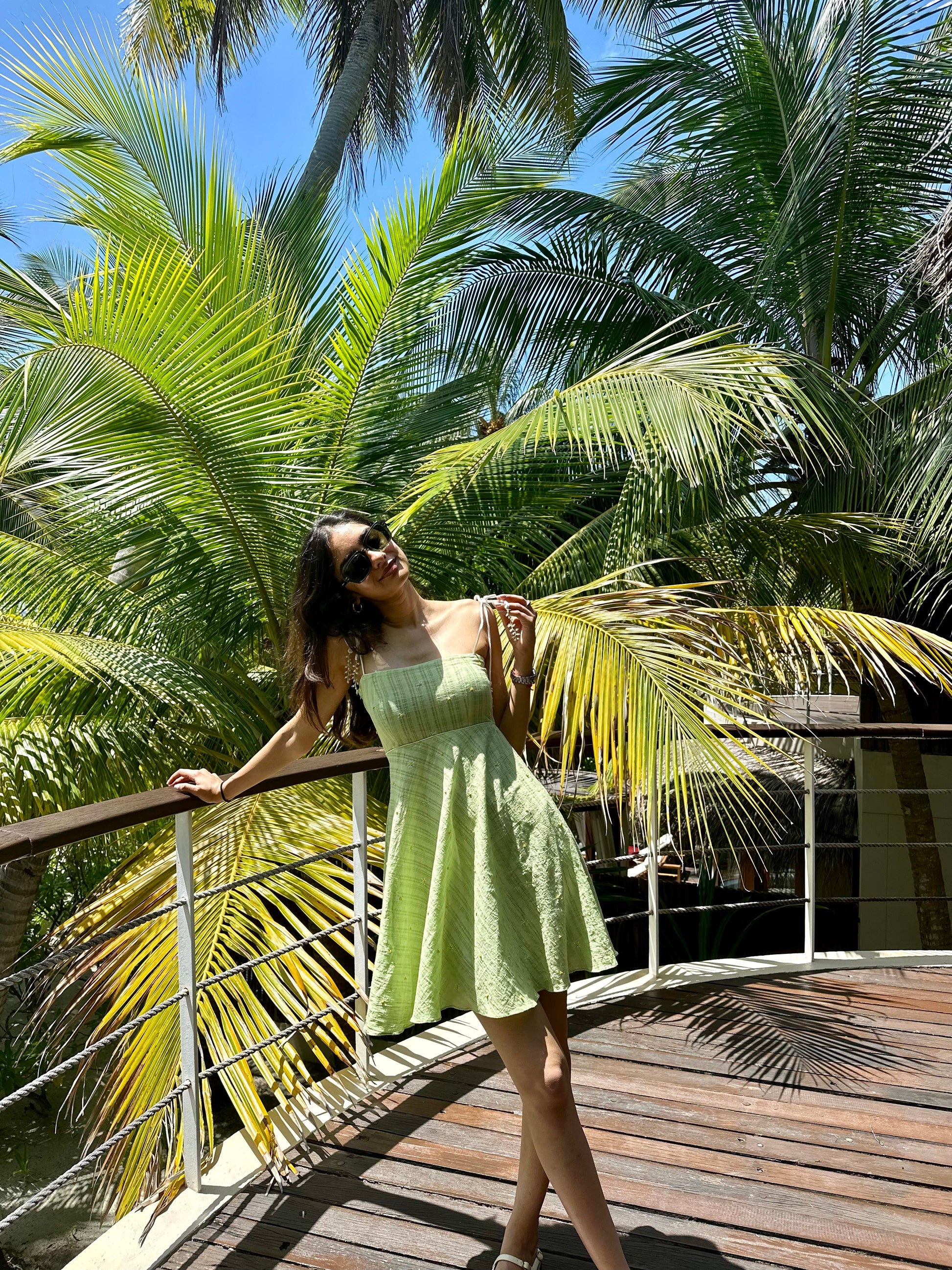 The perfect dress to take your sun-kissed photos in! The IVY dress is a detailed tie-strap mint green dress with hand-embroidered white flowers.🌼