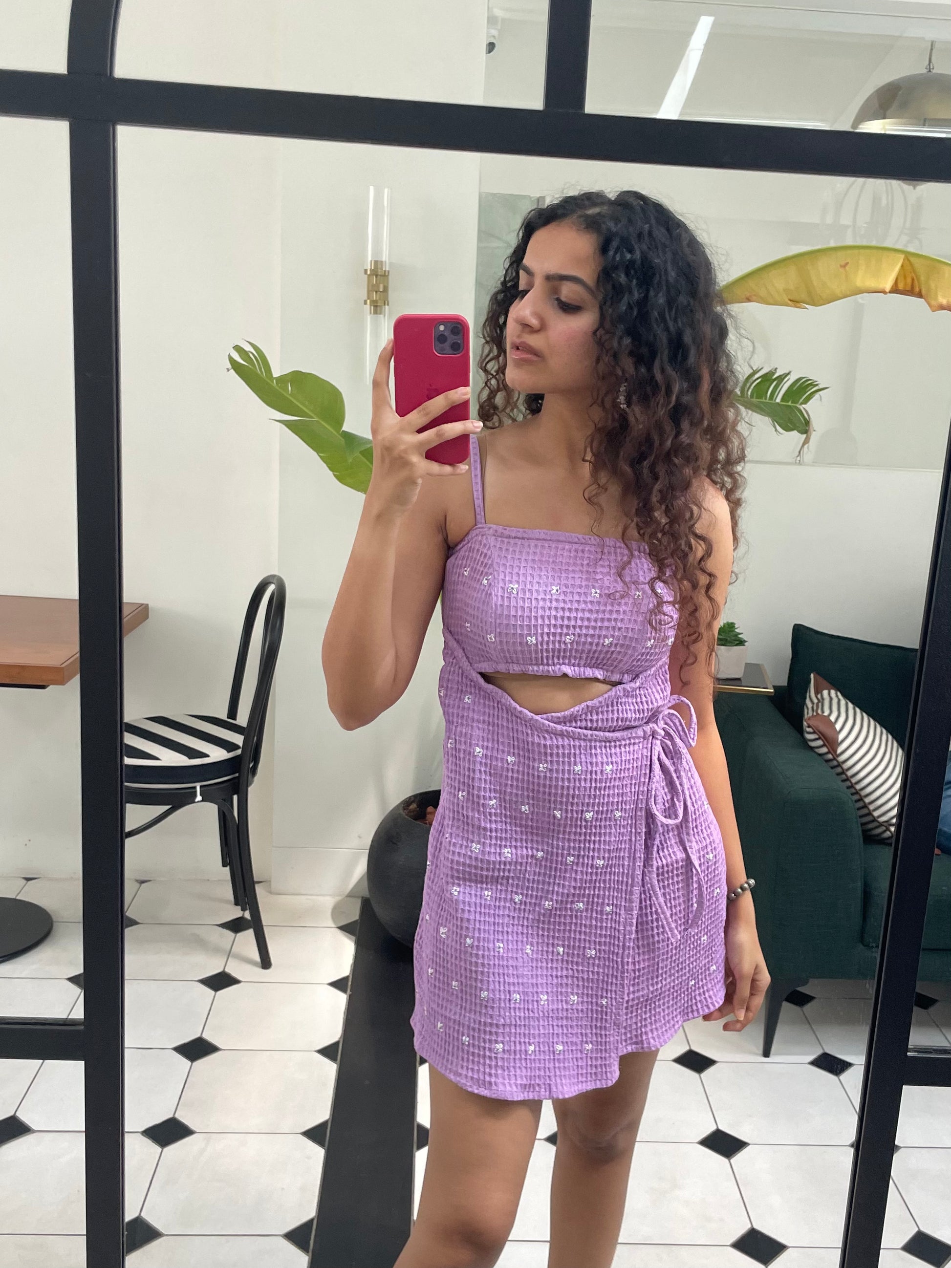 A spin off of our beloved Daisy set, this fresh and floral lilac is perfect for both, mountain or beach getaways. Made out of a stretchy 100% cotton waffle knit fabric, it is sprinkled with hand embroidered daisy’s and beads. The dress consists of a cut out under the bust, with two overlapping skirt flaps with tie details at the waist.