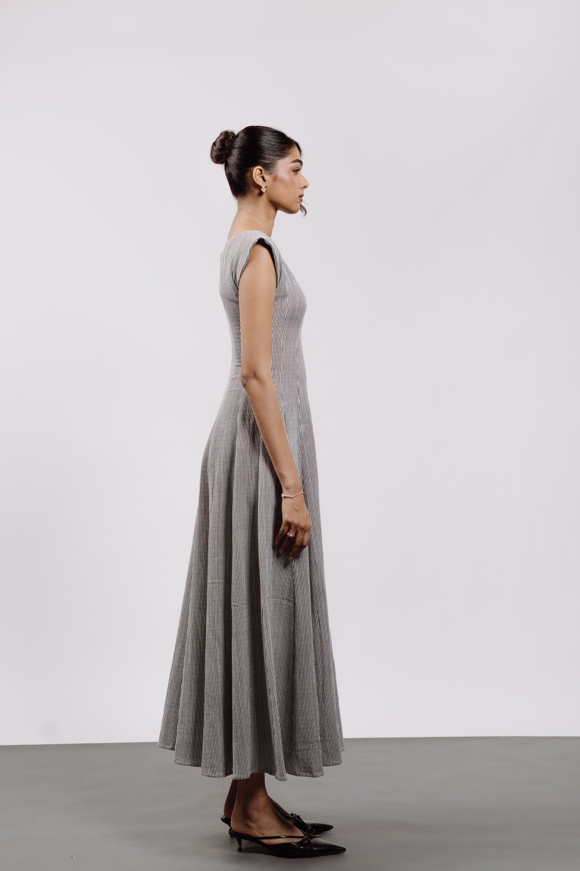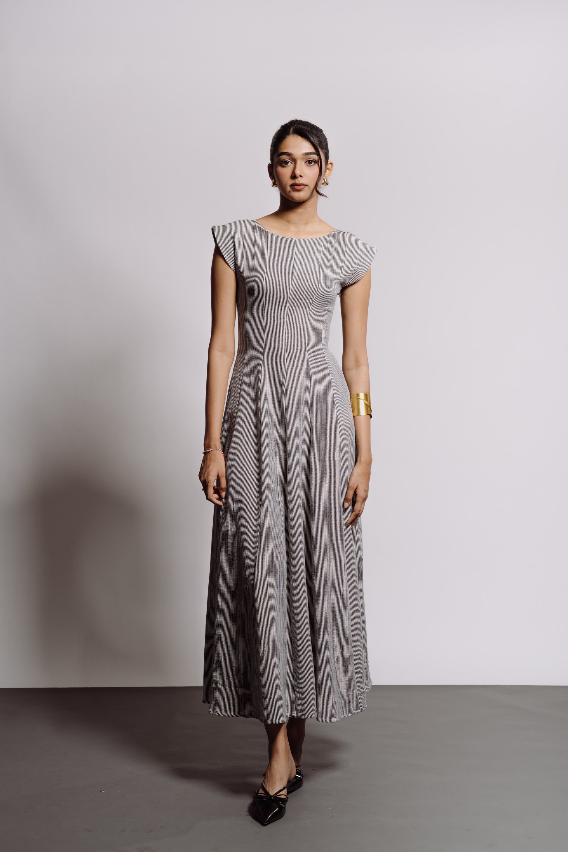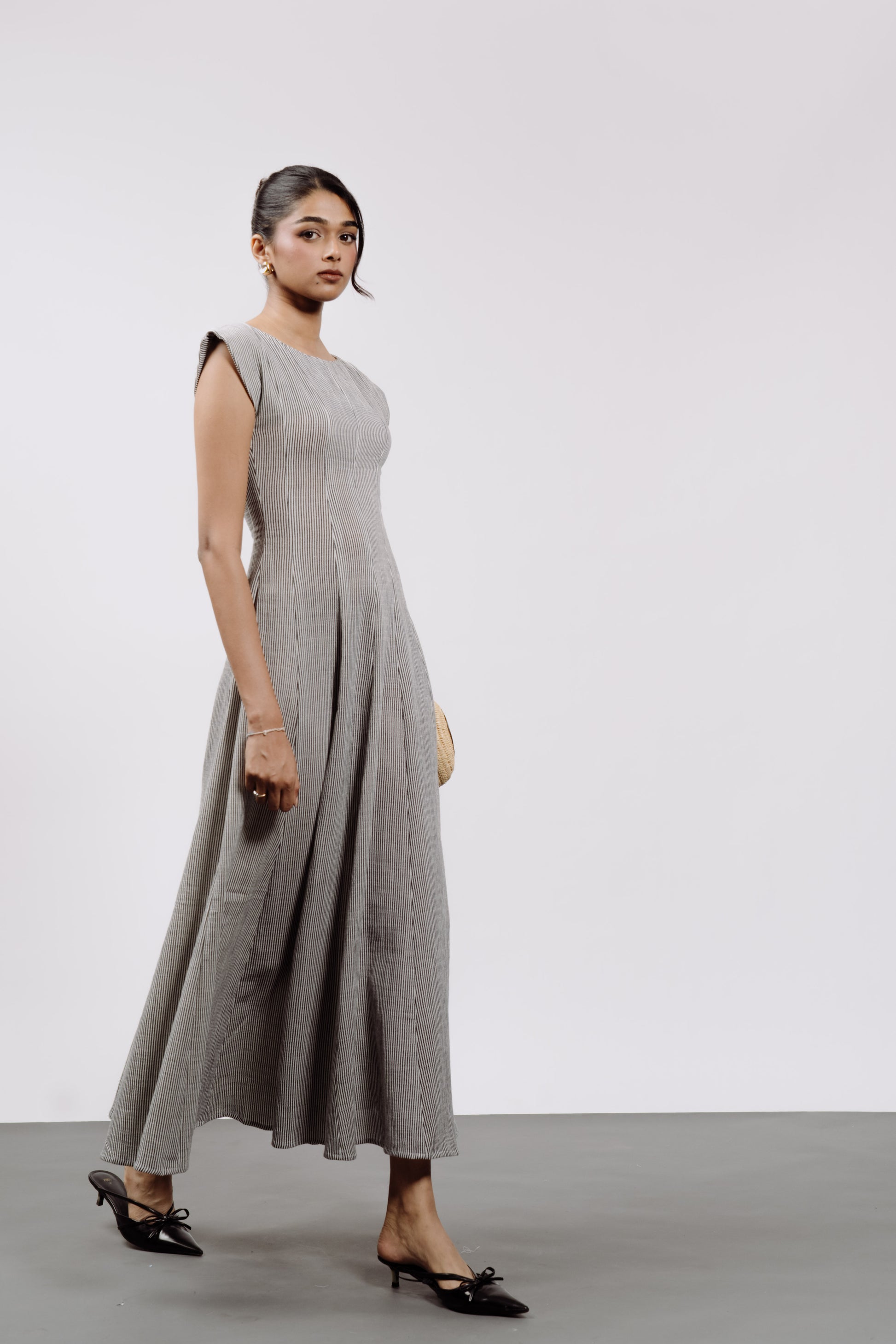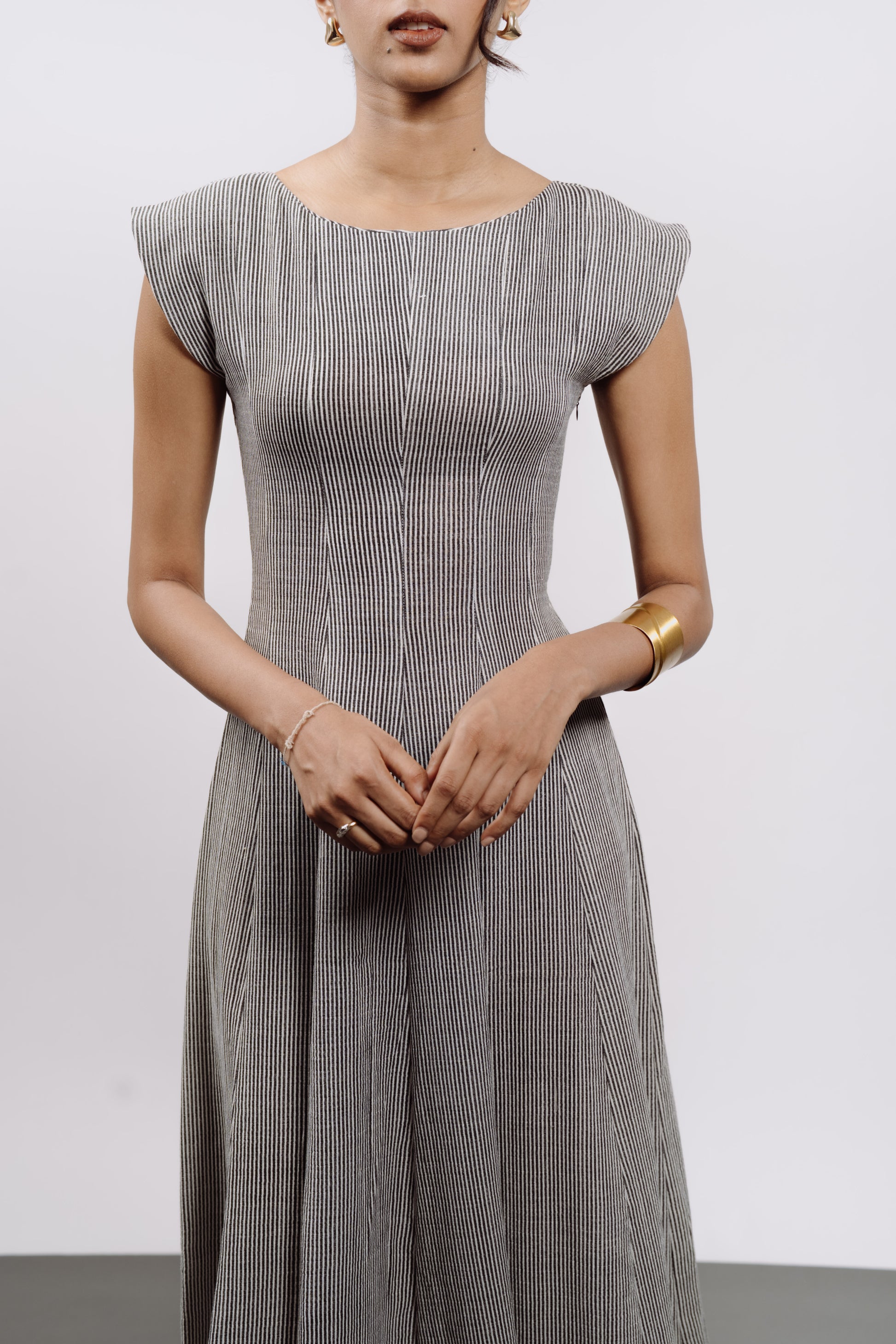 Sophisticated, sleek, and effortlessly minimal. This extended shoulder midi dress with fine vertical stripes and a cinched waist is all about flattering structure and understated elegance. Perfect for art galleries, coffee dates and evening soirees, just add bold accessories for that downtown vibe.