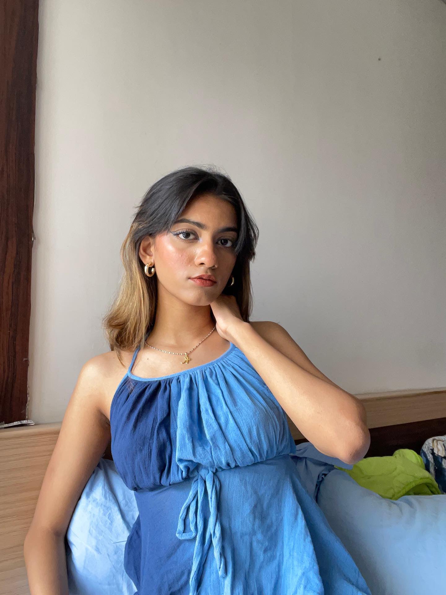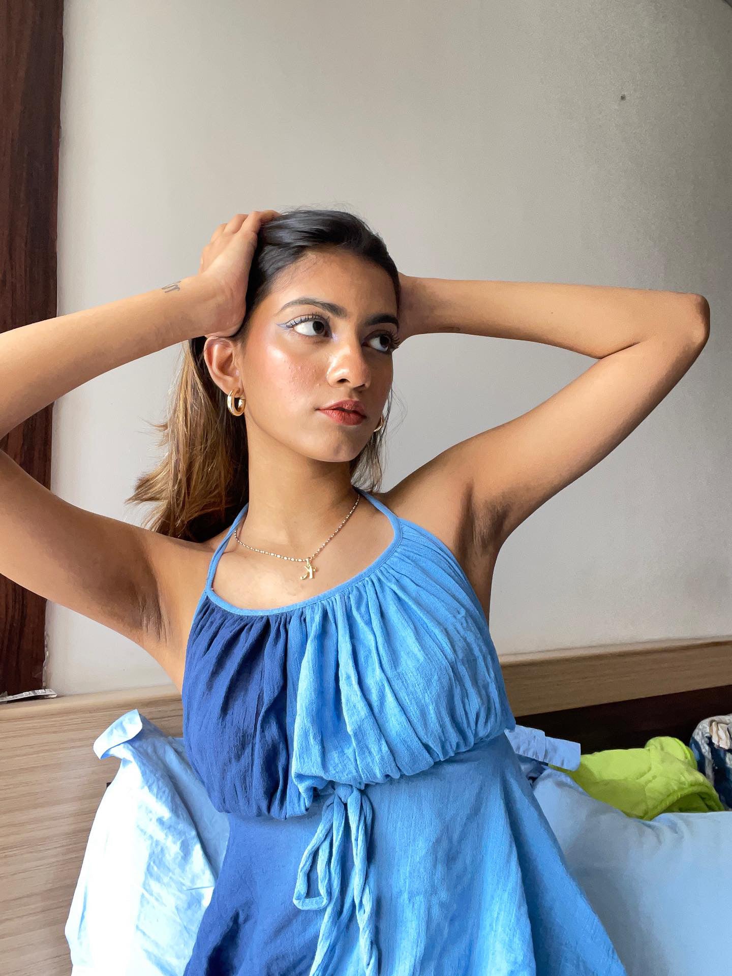 Summer is calling and the ombre navy top is answering! This flowy halter top is the perfect beachy chic addition to your wardrobe with its dreamy gradient from navy to light blue. Tie it up around your neck and show off your back for an extra touch of elegance and fun. Plus, it's 100% cotton for ultimate comfort during those hot summer days.