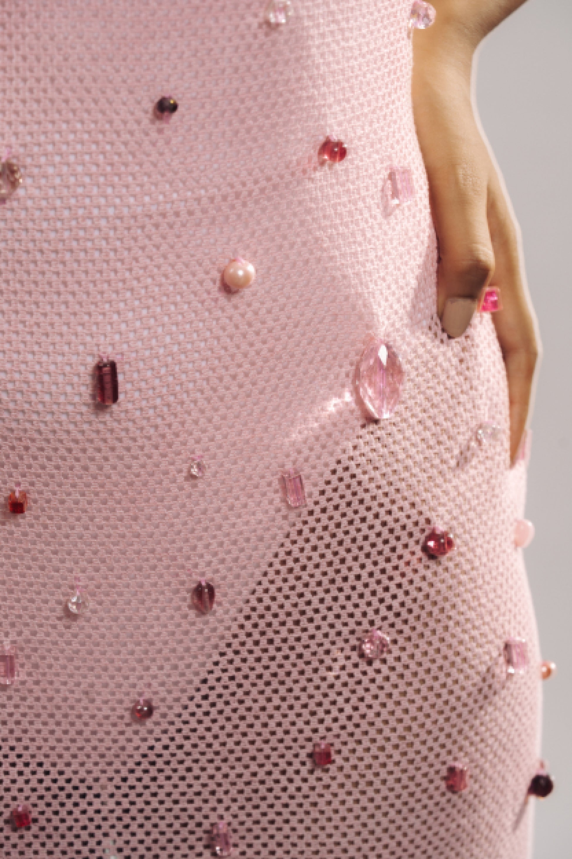 Turn heads in this pink knit cotton coverup featuring a halter neckline and an A-line silhouette. The front is beautifully embellished with glass, crystal, and ceramic beads, adding a luxe touch to its soft, breathable fabric—perfect for summer parties, day events, or a glam brunch.