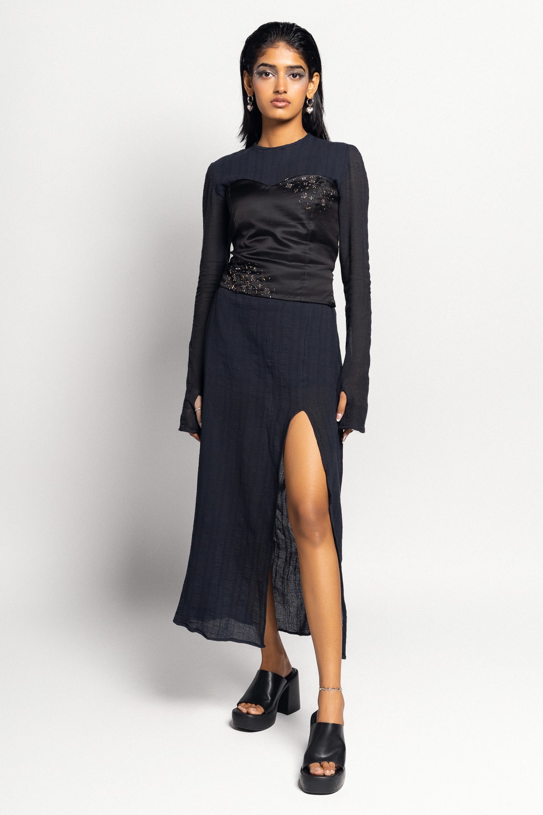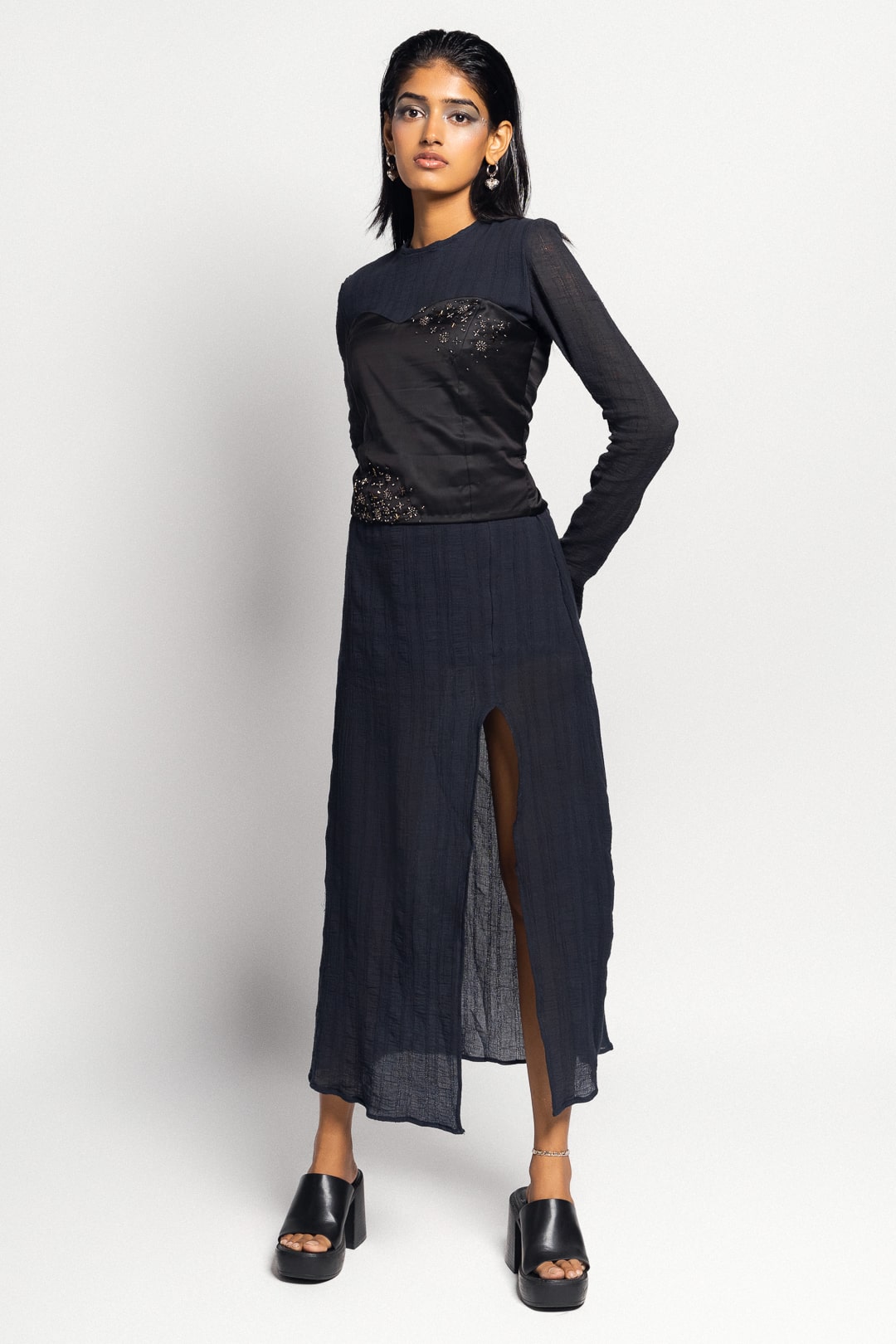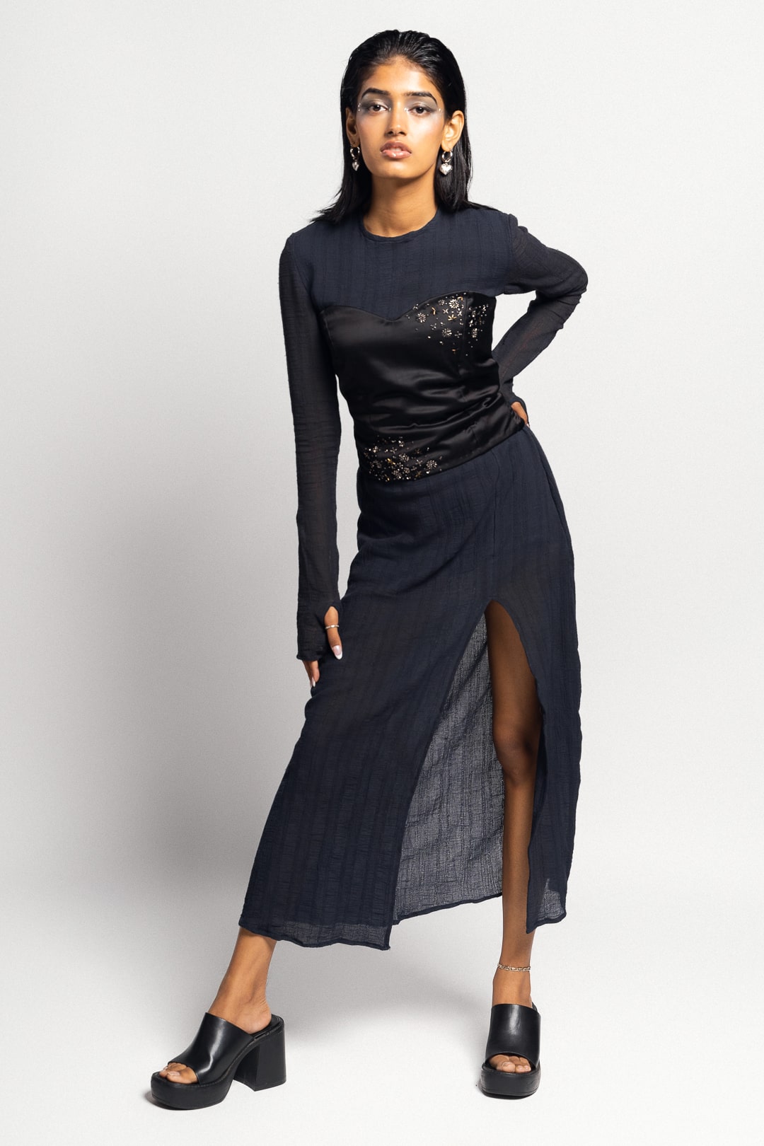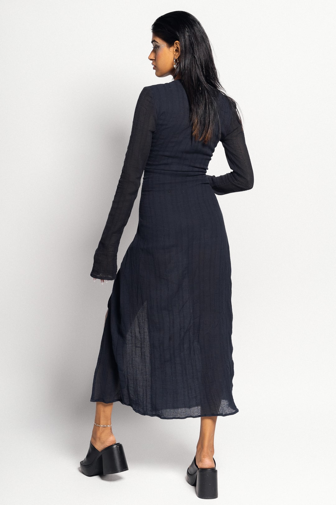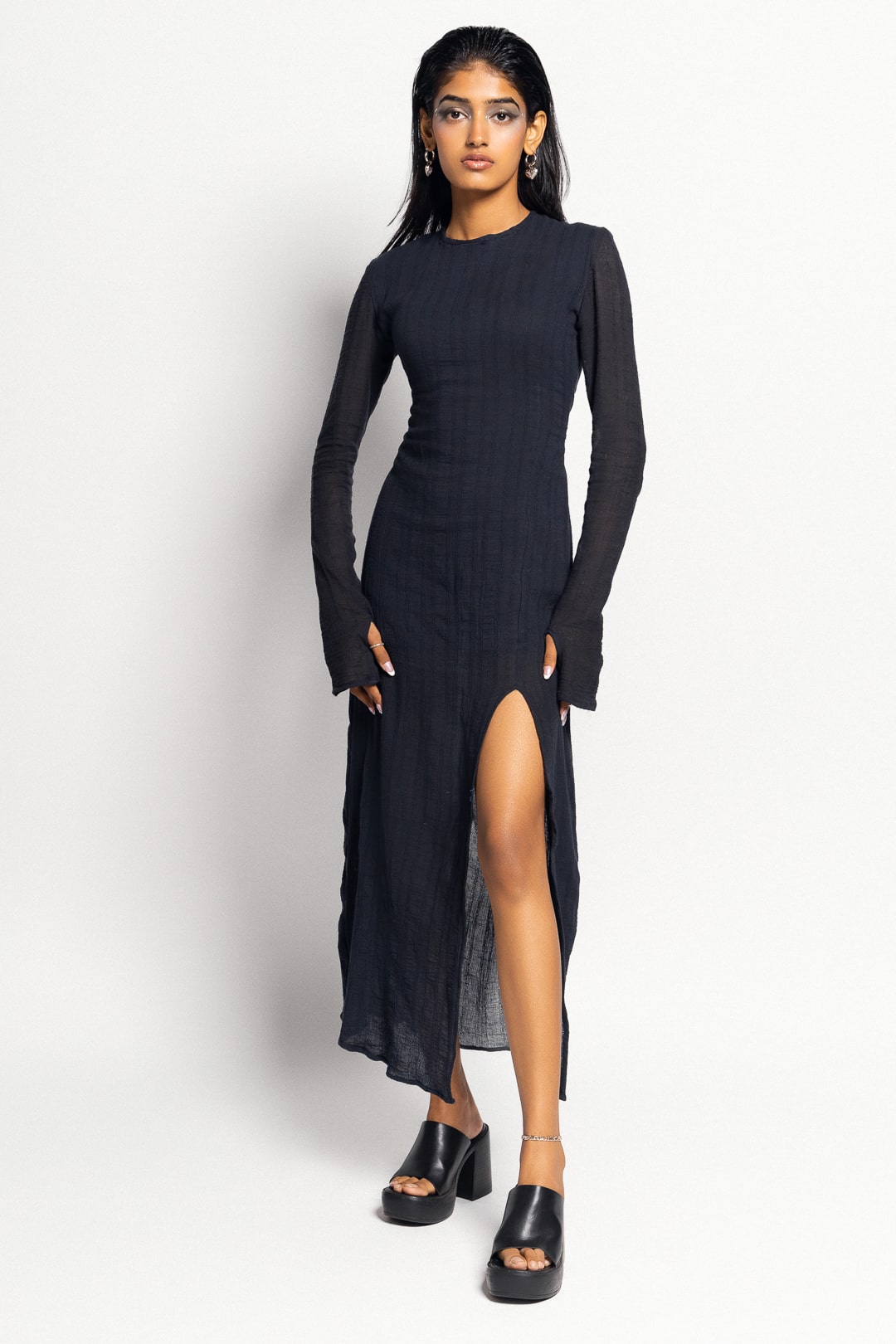 The Shirina dress is an all black dress that has a flattering fitted silhouette with long elongated sleeves that end with a thumbhole, and a slight up the side that ends at the mid-thigh. The dress is made from a lightweight, semi-sheer cotton fabric, and is lined from the bust to the upper thigh to provide coverage. This dress is the perfect base to create a stunning outfit by either dressing it up, or letting it do the talking tool.