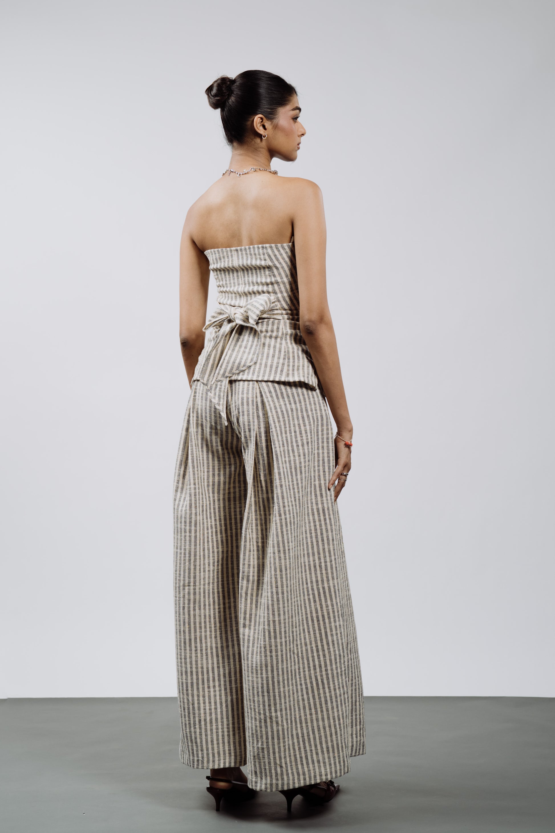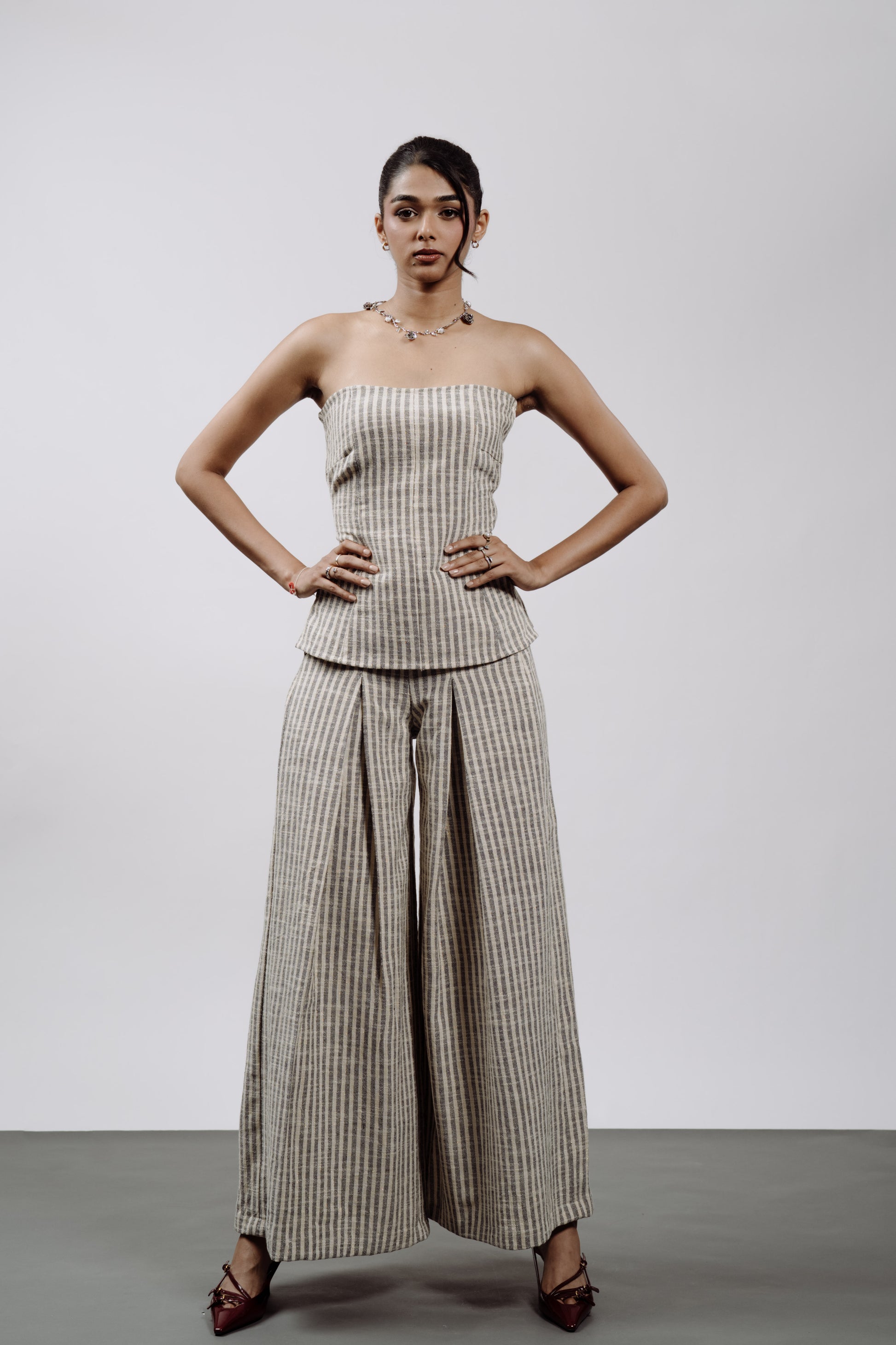 Effortless meets elevated. This strapless top and wide-leg pant set features soft vertical stripes that elongate and flatter. With its structured fit and relaxed flow, it's your go-to for city strolls, weekend brunches, or a night out - with heels or sneakers, you choose.