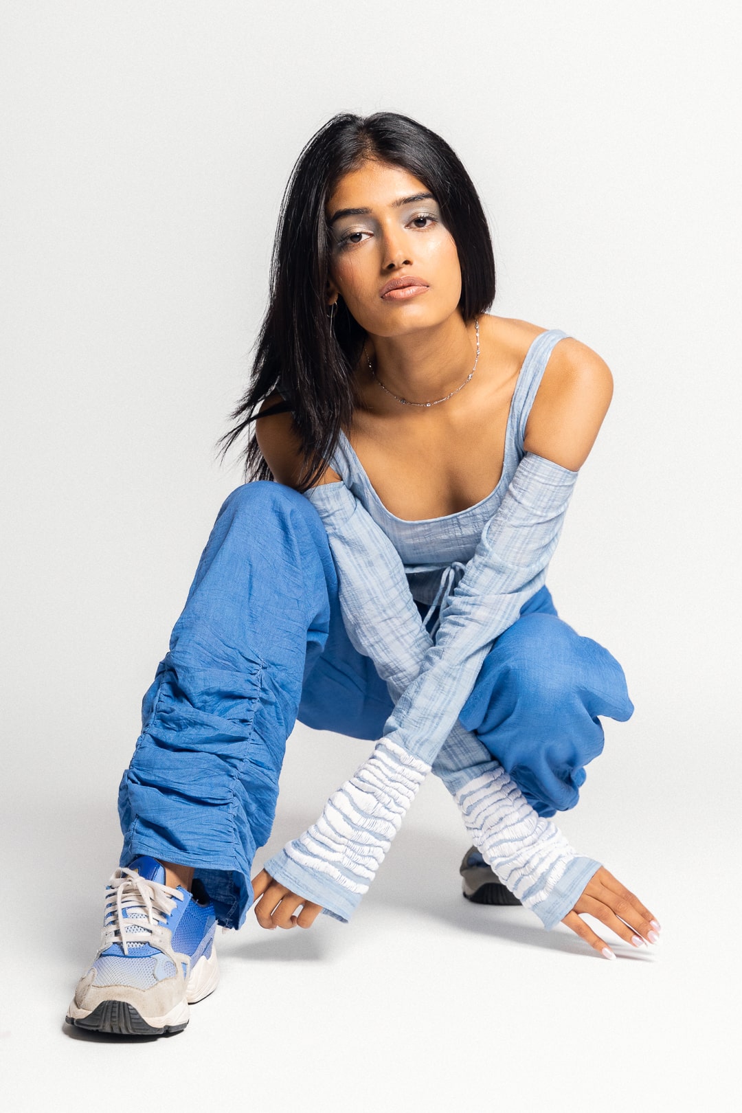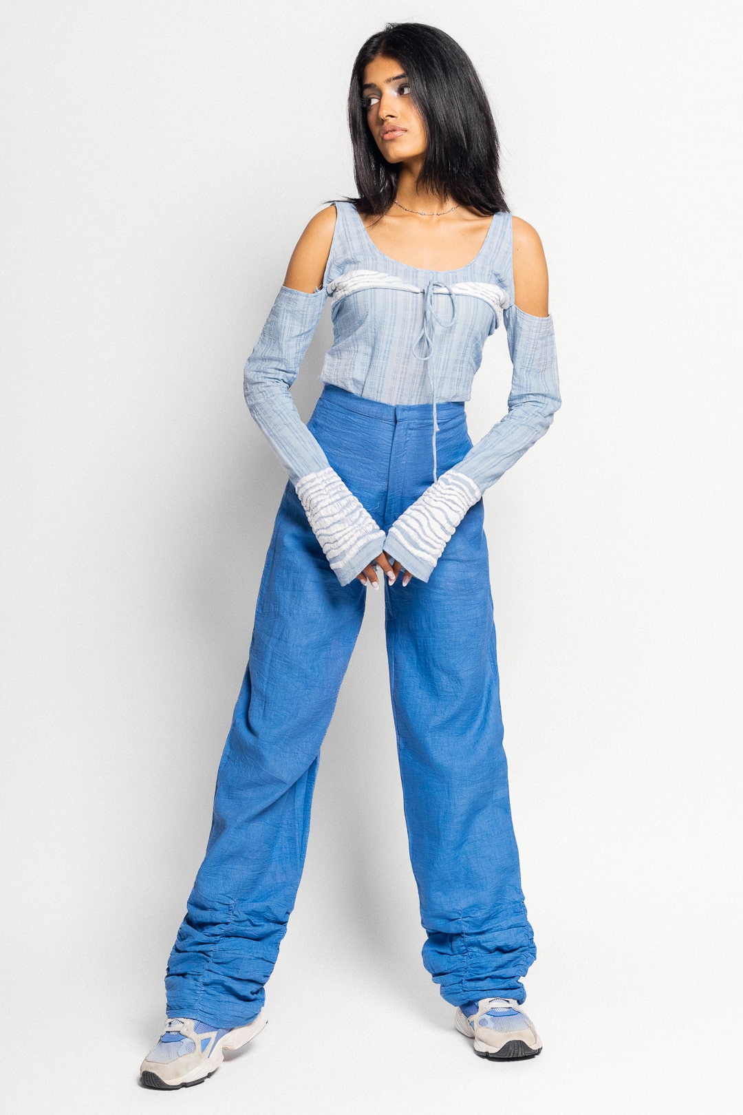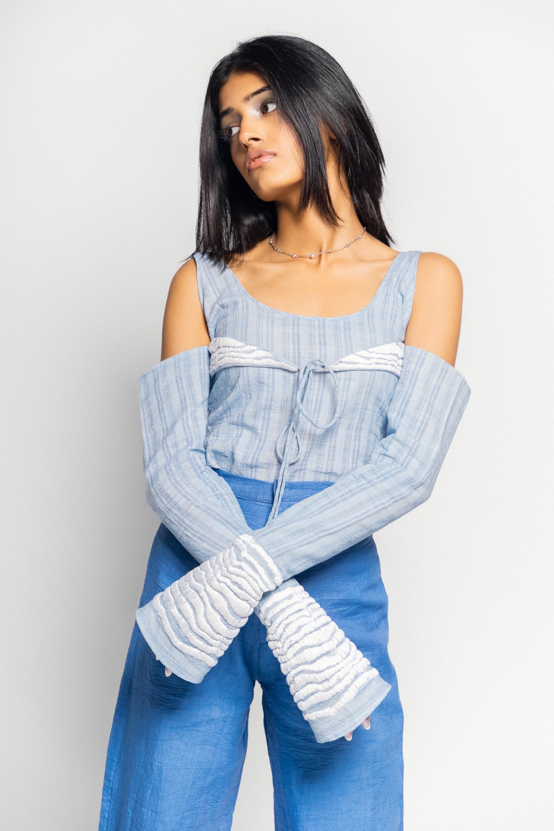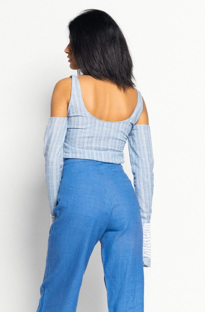 This top from the day sub-collection is the perfect cut out top with a low scoop neck layered with a tie up at the bust, cold shoulders and sleeves that flare at the wrist. The top is made from a 100% cotton fabric with a striped weave variation. The tie flaps at the front and wrists have a straight stitch hand embroidery detail that was inspired by the stratus clouds.