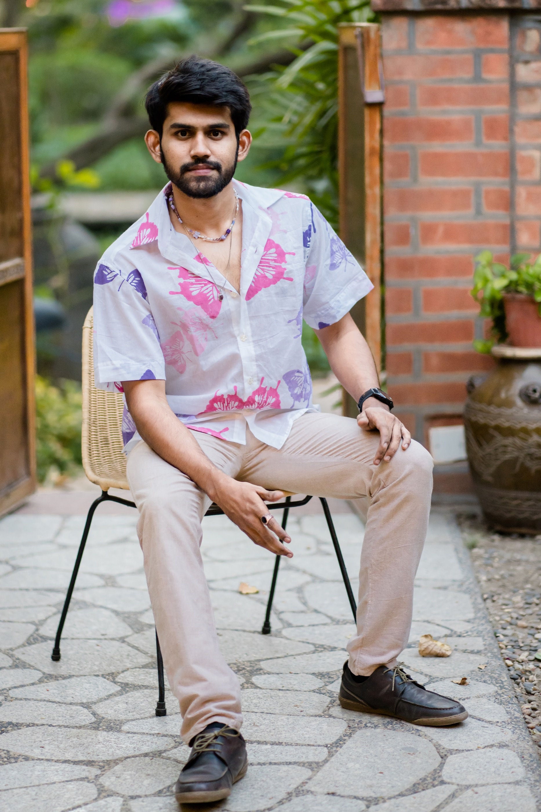 The Titli Shirt is the perfect, relaxed summer half-sleeved shirt. Block printed by hand on a 100% mulmul fabric, it is light and breathe-able. The Titli shirt is available in two colours - Pink/Purple and Blues.