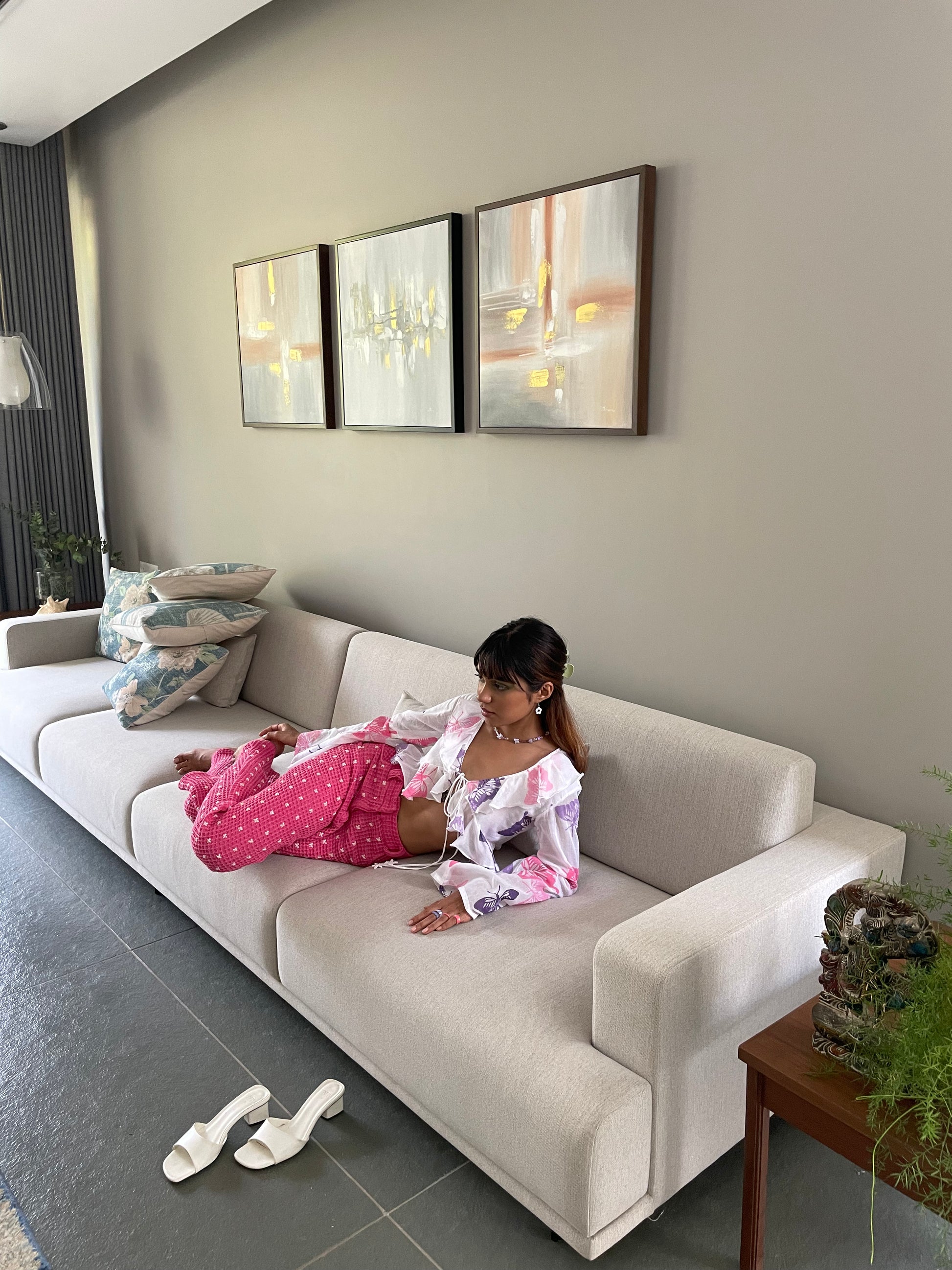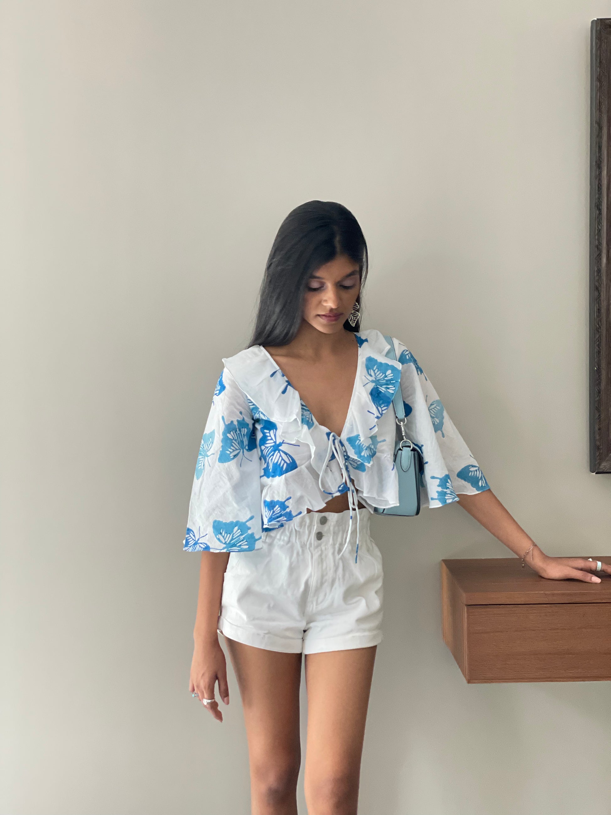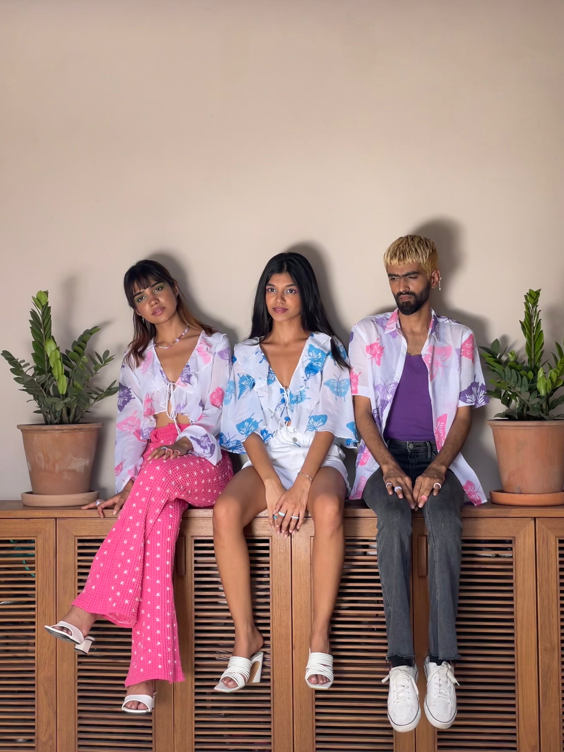The Titli Top is a tie-at-front top with the cutest frills running along the neckline and hemline. With loose bell sleeves and block-printed 100% cotton mulmul fabric, its the comfiest top for the hot weather. It is available in two colourways - Pink/Purple and Blues.