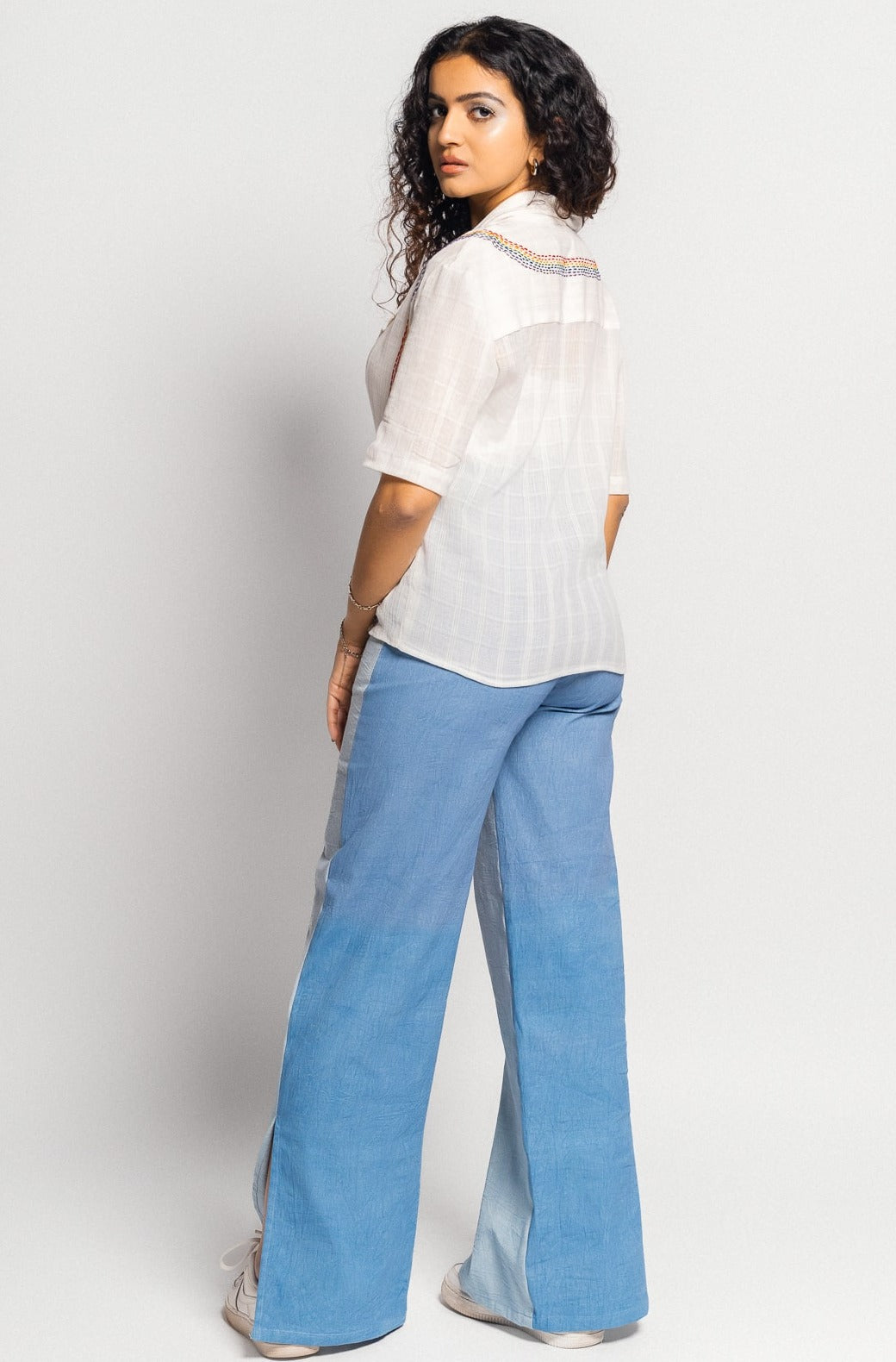 The pants are inspired by the shades of the day sky, hence the two shades in the front and the back. They are made from a 100% cotton drill fabric, similar to a lightweight denim. The silhouette features a high wasited rise, fitted upper thights and then a relaxed fit with slits at the side seam. The pants also have two side seam pockets.