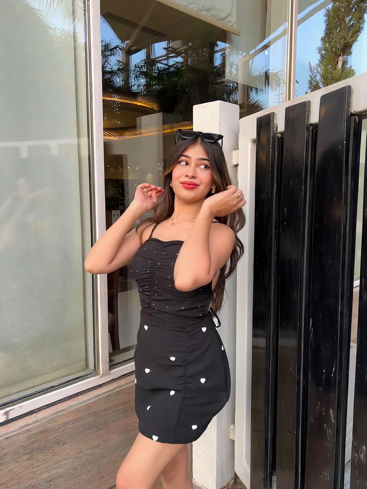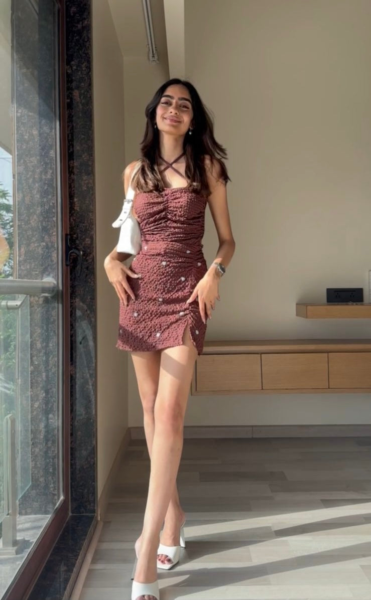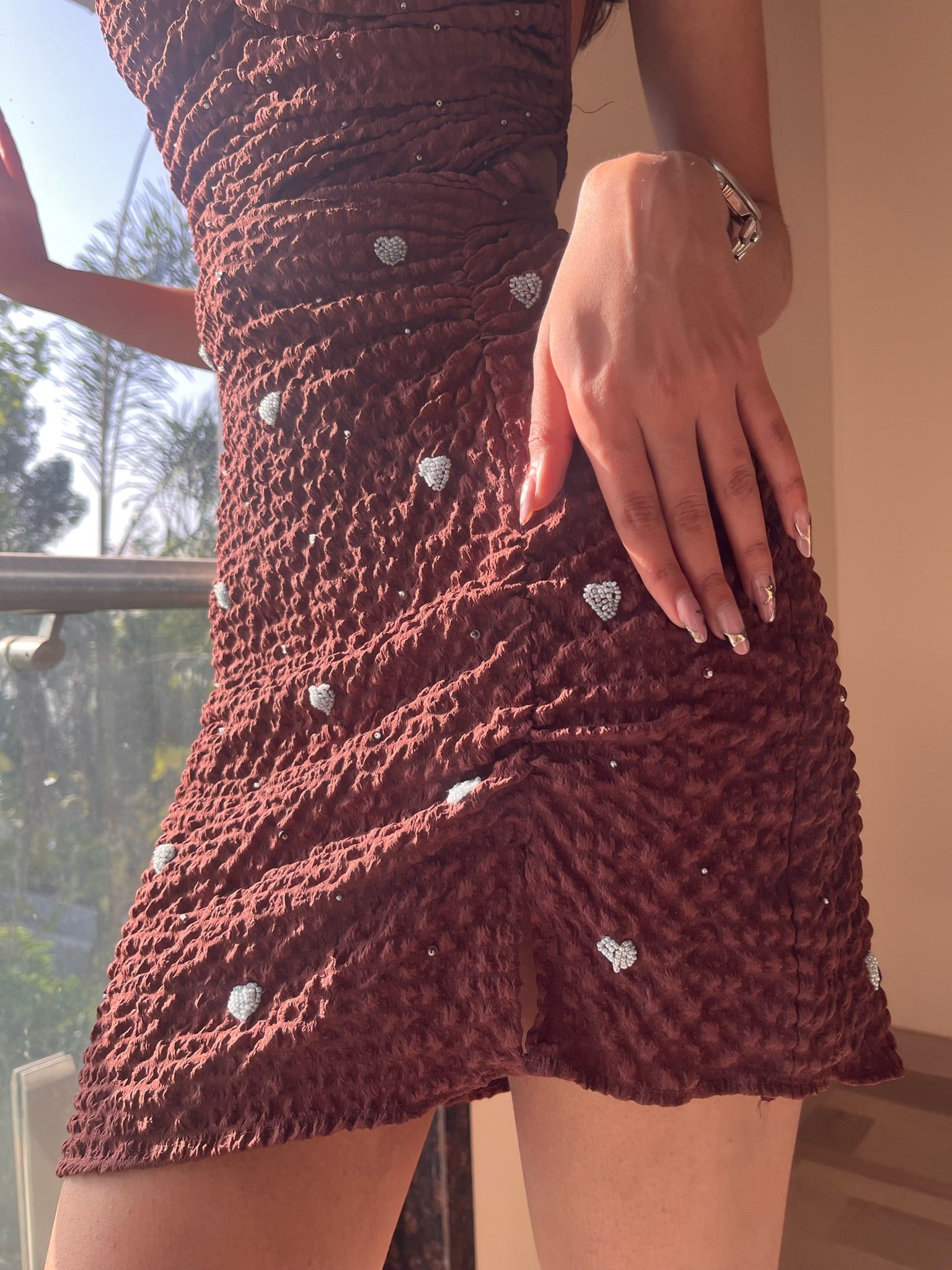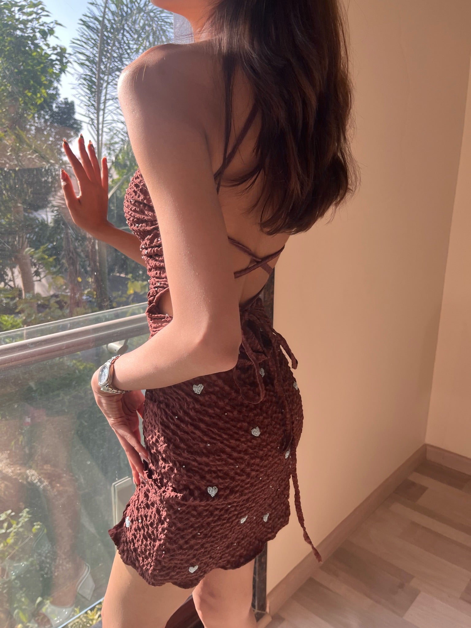 Indulge in playful charm with this backless brown mini dress, adorned with delicate white heart detailing that whimsically dances across the fabric. The dress features an alluring ruching, adding a touch of grace. Whether you're feeling sweet or sassy, this dress is sure to capture the perfect blend of chic and romantic allure.
